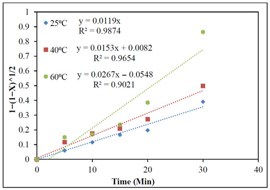 The plots of 1 − (1 − X)1/2 versus t at different temperatures (25–60 °C) gave excellent linear fits with R2 values between 0.90 and 0.96 (Figure 9). The increasing slopes at higher temperatures show that the diffusion process accelerates with thermal energy, consistent with enhanced ion transport through the product layer.
