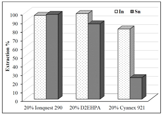 In order to identify a suitable extractant for selective recovery of In from the leach liquor, three common classes of organophosphorus reagents were evaluated: the acidic extractant 20% D2EHPA (v/v) diluted in kerosene oil with 2% Isodecanol (v/v), the neutral extractant 20% Cyanex 921 (v/v) diluted in kerosene oil with 2% Isodecanol, and the acidic phosphinic acid 20% Ionquest 290 (v/v) diluted in kerosene oil with 2% Isodecanol. D2EHPA is widely used in base metal separations due to its strong affinity for trivalent cations; however, the stripping of metals from this organic is very difficult [15]. Ionquest 290 showed great extraction of In with co-extraction of Sn, but Cyanex 921 showed even better extraction efficiencies for indium, with minimal co-extraction of Sn, as shown in Figure 11. Considering these, Cyanex 921 was chosen as the preferred extractant for further studies in this work.