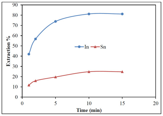 The extraction of In by 20% Cyanex 921 was studied over a range of 5–15 min. The recovery increased sharply during the initial stage and reached near-equilibrium at about 10 min, after which no significant improvement was observed (Figure 13). Therefore, 15 min mixing time was fixed as the operational time to give a little excess time to get a stabilized equilibrium. This may be explained by the fact that indium extraction involves a surface-controlled exchange process at the aqueous–organic interface. At the beginning, the large concentration gradient between indium ions in the aqueous phase and the free extractant molecules in the organic phase drives rapid mass transfer. As the available extractant sites become progressively occupied, the driving force for further transfer decreases, and the system approaches equilibrium, so longer contact times provide no additional benefit [18,19,20]. Hence, 15 min was adopted as the operational contact time for further studies.