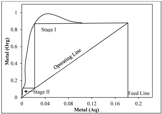 To observe the effect of organic-to-aqueous (O/A) phase ratio on the extraction of In from the leach liquor, the phase ratio was systematically varied from 1/9 to 9/1 while maintaining a constant pH 2.5 and a mixing time of 15 min. To determine the number of counter-current extraction stages required for nearly complete In recovery, a McCabe–Thiele diagram was constructed using the data obtained from the effect of organic-to-aqueous (O/A) phase ratio. It is a plot of metal distribution between aqueous (X-axis) and organic (Y-axis) phases [15]. It was found that at 1/1 (O/A ratio), two-stage extraction is required to completely load In in the organic phase, as shown in Figure 14. Further studies indicated that In loading at 1/1 is nearly the same as loading at 1/3 and starts falling beyond 1/3. Thus, to minimize the reagent usage, a 1/3 ratio was optimized. After loading In in the organic phase, 10% H2SO4 was used for stripping to recover 97.1% In in the stripped solution.