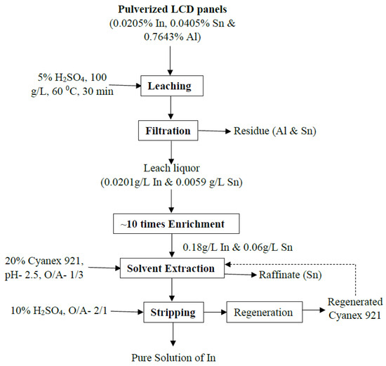 - This approach demonstrates strong potential for industrial application. The process combines efficiency, selectivity, and scalability while relying on inexpensive reagents and elementary equipment. These advantages position the developed flow sheet as a practical solution for indium recovery from LCD waste, with clear economic and environmental benefits that align with sustainable resource management.