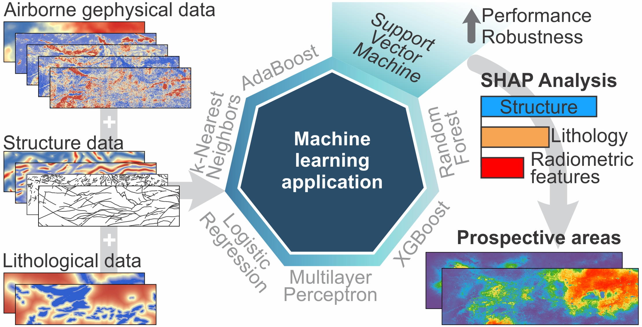 - Kuhn, S.; Cracknell, M.J.; Reading, A.M. Lithologic mapping using Random Forests applied to geophysical and remote-sensing data: A demonstration study from the Eastern Goldfields of Australia. Geophysics 2018, 83, B183–B193. [Google Scholar] [CrossRef]