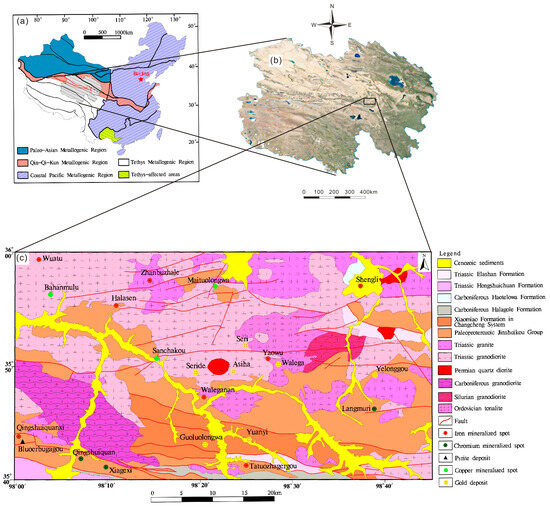 - Chen, J.J.; Wei, J.H.; Fu, L.B.; Li, H.; Zhou, H.Z.; Zhao, X.; Zhan, X.F.; Tan, J. Multiple sources of the Early Mesozoic Gouli batholith, Eastern Kunlun Orogenic Belt, northern Tibetan Plateau: Linking continental crustal growth with oceanic subduction. Lithos 2017, 292, 161–178. [Google Scholar] [CrossRef]