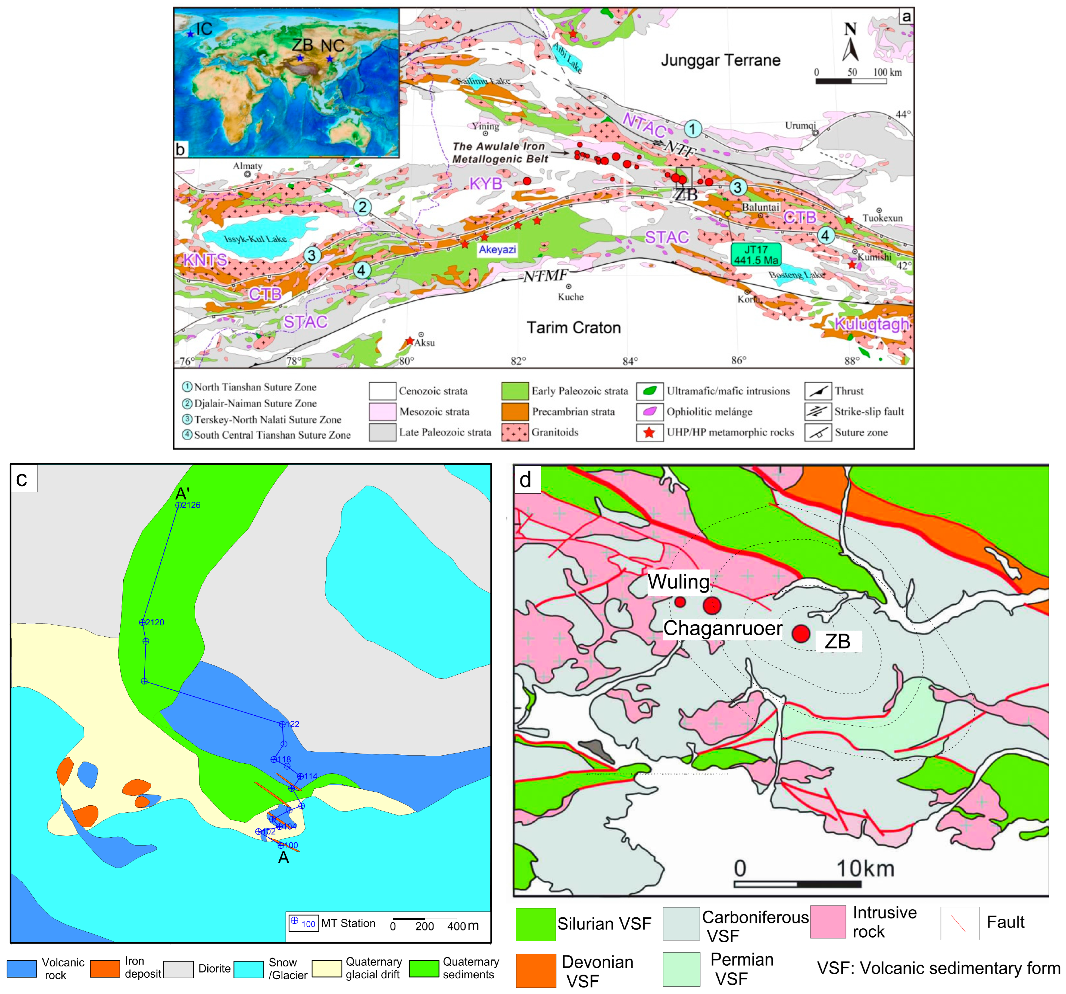- Wang, X.S.; Zhang, X.; Gao, J.; Li, J.L.; Jiang, T.; Xue, S.C. A slab break-off model for the submarine volcanic-hosted iron mineralization in the Chinese Western Tianshan: Insights from Paleozoic subduction-related to post-collisional magmatism. Ore Geol. Rev. 2018, 92, 144–160. [Google Scholar] [CrossRef]