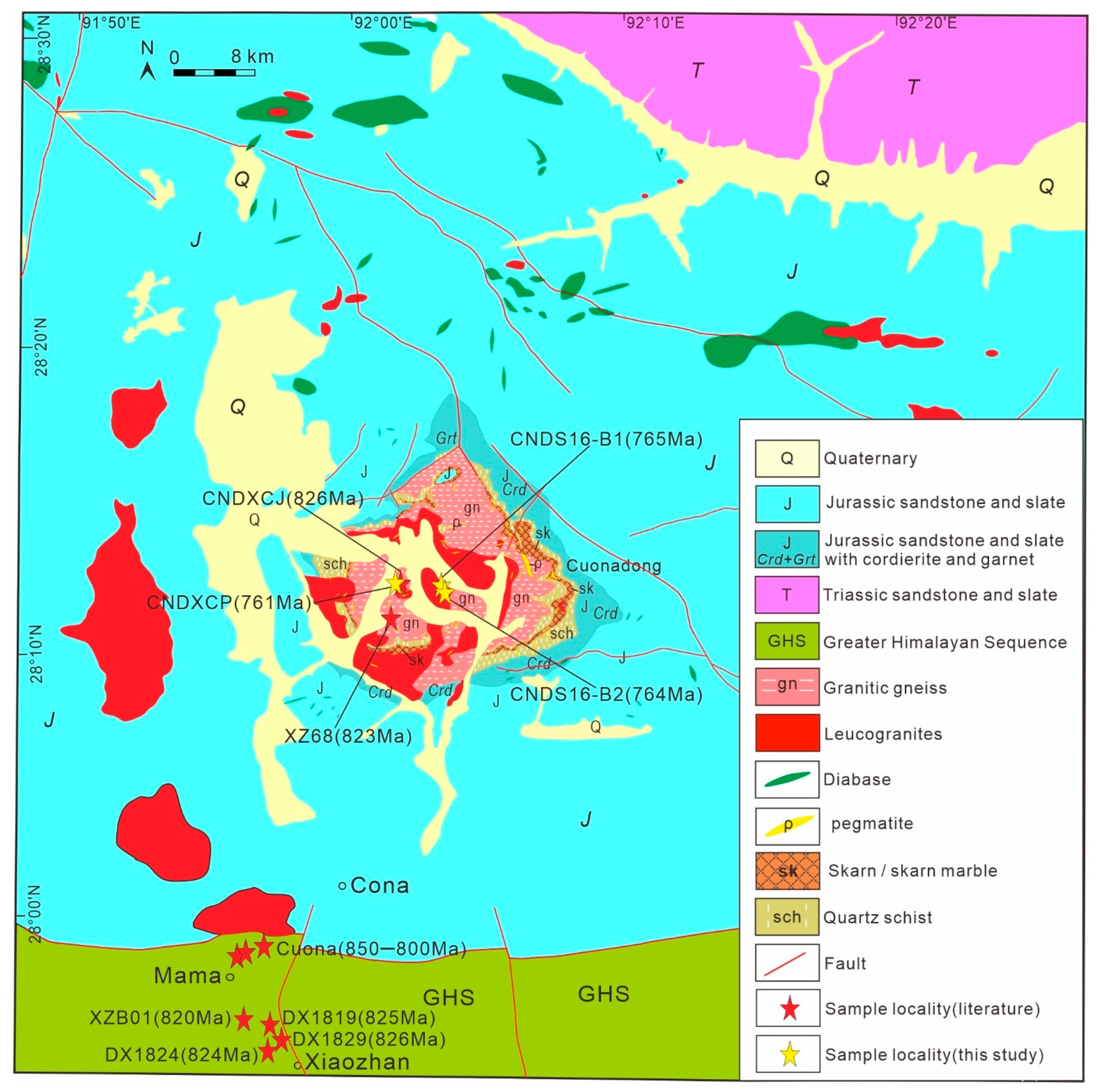 - Zhang, Z.; Zhang, L.K.; Li, G.M.; Liang, W.; Xia, X.B.; Fu, J.G.; Dong, S.L.; Ma, G.T. The Cuonadong Gneiss Dome of North Himalaya: A New Member of Gneiss Dome and a New Proposition form the Ore-controlling Role of North Himalaya Gneiss Domes. Acta Geosci. Sin. 2017, 38, 754–766, (In Chinese with English Abstract). [Google Scholar]