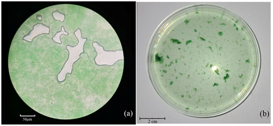 Figure 1 shows the micro and macro structure of the growing algae colony in this study. As illustrated in Figure 1a, the microstructure of algae, captured through a microscope, reveals cell-level characteristics with green eukaryotic cells arranged in colonies. This view represents the microscopic scale, where individual cells are visible. In Figure 1b, the macrostructure of algae is shown at the scale visible to the naked eye in a Petri dish, displaying the overall appearance, spatial distribution, and clumping of algal biomass. This reflects the large-scale form and organization of the culture.