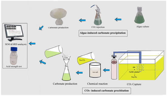 To address limitations, algae have emerged as a promising alternative biological agent for carbonate precipitation, offering an eco-friendly and sustainable approach to carbon sequestration and biomineralization [10]. During photosynthesis, algae consume CO2 and increase local pH, promoting the conversion of dissolved inorganic carbon into carbonate (CO32−) and bicarbonate (HCO3−) ions. In the presence of bivalent ions (e.g., Ca2+, Mg2+), these species precipitate as solid carbonate minerals such as calcite or aragonite. This biologically driven process, known as algae-induced carbonate precipitation, can occur in both freshwater and marine environments. The advantages of using microalgae include natural CO2 uptake, low energy requirements, the potential for large-scale cultivation, and the co-benefit of biomass production for biofuels, animal feed or nutrient recovery creating opportunities for integrated, circular approaches [11,12,13,14]. Additionally, algae can grow on non-arable land and in wastewater, offering potential benefits for integrated carbon capture and water treatment systems. Their photosynthetic activity not only drives carbonate mineralization but also contributes oxygen to the environment, enhancing ecological compatibility. Microalgae can also improve mineral durability by secreting extracellular polymeric substances (EPS) that bind and protect crystals [15]. However, limitations remain, including the dependence on light and nutrients and the need for optimal environmental conditions to maintain microalgal growth, the relatively slow precipitation rates, and difficulties in controlling mineral morphology [16]. Despite these constraints, algae-based carbonate precipitation holds significant potential for sustainable carbon capture and sequestration, biomaterial production, and environmental remediation.