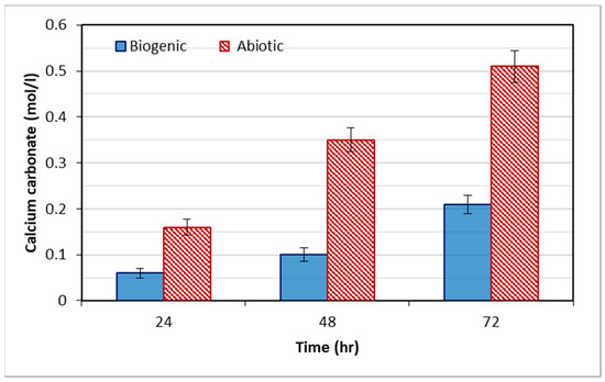 Figure 3 presents a comparison of calcium carbonate generated through biogenic (algae-induced) and abiotic (chemical) processes via CO2 absorption. As shown in the figure, the amount of calcium carbonate produced by microalgae (0.21 mol/L) was about half the amount of carbonate produced through the abiotic CO2 capture process (0.51 mol/L) over 72 h. However, calcium carbonate precipitation induced by microalgae in 72 h was comparable to that induced by S. pasteurii (about 0.25 mol/L), as reported in [1]. S. pasteurii is the predominant strain used by MICP researchers worldwide for its high efficiency in precipitating carbonate biotically, through the urea hydrolysis pathway; therefore, this finding is very encouraging for the alternative use of algae instead of this ureolytic bacterium for soil biocementation by carbonate precipitation, to prevent ammonia release and, importantly, sequester CO2 in the carbonate precipitation process.