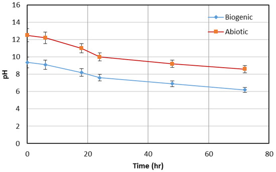 As shown in Figure 4, the pH of the initial solution changed over 72 h as a result of both biogenic and abiotic chemical reactions involved in carbonate formation. These processes include the generation of bicarbonate (HCO3−) and carbonate (CO32−) ions through CO2 uptake. In the case of the microalgae-induced process, the pH decreased significantly from 9.3 to 6.1 during the reaction period. In contrast, the abiotic CO2 capture process showed a pH drop from 12.5 to 8.6. This indicates that for effective carbonate mineral precipitation, particularly in microalgae-based systems, the pH was carefully adjusted to above 8 by adding 0.5 M NaOH, as carbonate minerals preferentially form in alkaline conditions.