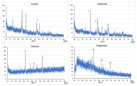 Figure 5 shows the XRD analysis results of the carbonate minerals produced by microalgae. As shown in the graphs, CaCO3 is identified as calcite (Figure 5a), while the precipitate containing CaMg(CO3)2 corresponds to dolomite (Figure 5b). Under conditions with a higher Mg/Ca ratio, both calcite and dolomite were formed, with a relative proportion of 60% calcite and 40% dolomite, as shown in Figure 5b. Additionally, FeCO3 was identified as siderite, and MgCO3 as magnesite, as seen in Figure 6c,d, respectively.