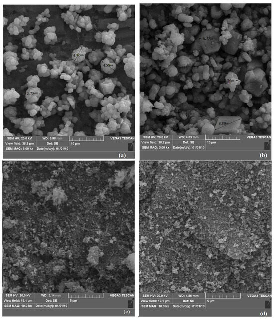 Figure 6 presents SEM images comparing the minerals formed through algae-induced precipitation. As observed in Figure 6a, CaCO3 crystals, with an average size of 3–5 µm, were deposited in a calcium-rich environment. These crystals exhibit polygonal, spheroidal, or agglomerated morphologies. With increasing Mg/Ca ratios in the input solution, both CaMg(CO3)2 and CaCO3 crystals were formed. Figure 6b shows CaMg(CO3)2 crystals, averaging 6–8 µm in size and exhibiting rhombohedral shapes, embedded between CaCO3 crystals. In contrast, Figure 6c,d display fine FeCO3 and MgCO3 particles, characterized by strong agglomeration and a granular to spheroidal morphology, with particle sizes typically below 0.5 µm, all formed by microalgal activity.