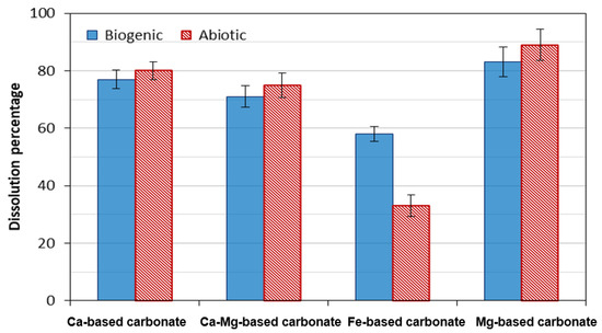Figure 8 illustrates the dissolution percentages of various carbonate minerals in an acidic environment (0.5 M HCl), with minerals precipitated by both microalgae and CO2 capture. As depicted in the figure, all carbonate minerals exhibited low resistance to dissolution in the acidic medium. However, siderite demonstrated a significantly lower dissolution percentage, indicating its superior stability and strength in acidic conditions. Carbonate minerals precipitated by microalgae showed slightly higher resistance to dissolution compared to those formed through the abiotic CO2 capture process, which may be linked to differences in crystal structure or composition resulting from the biological process.
