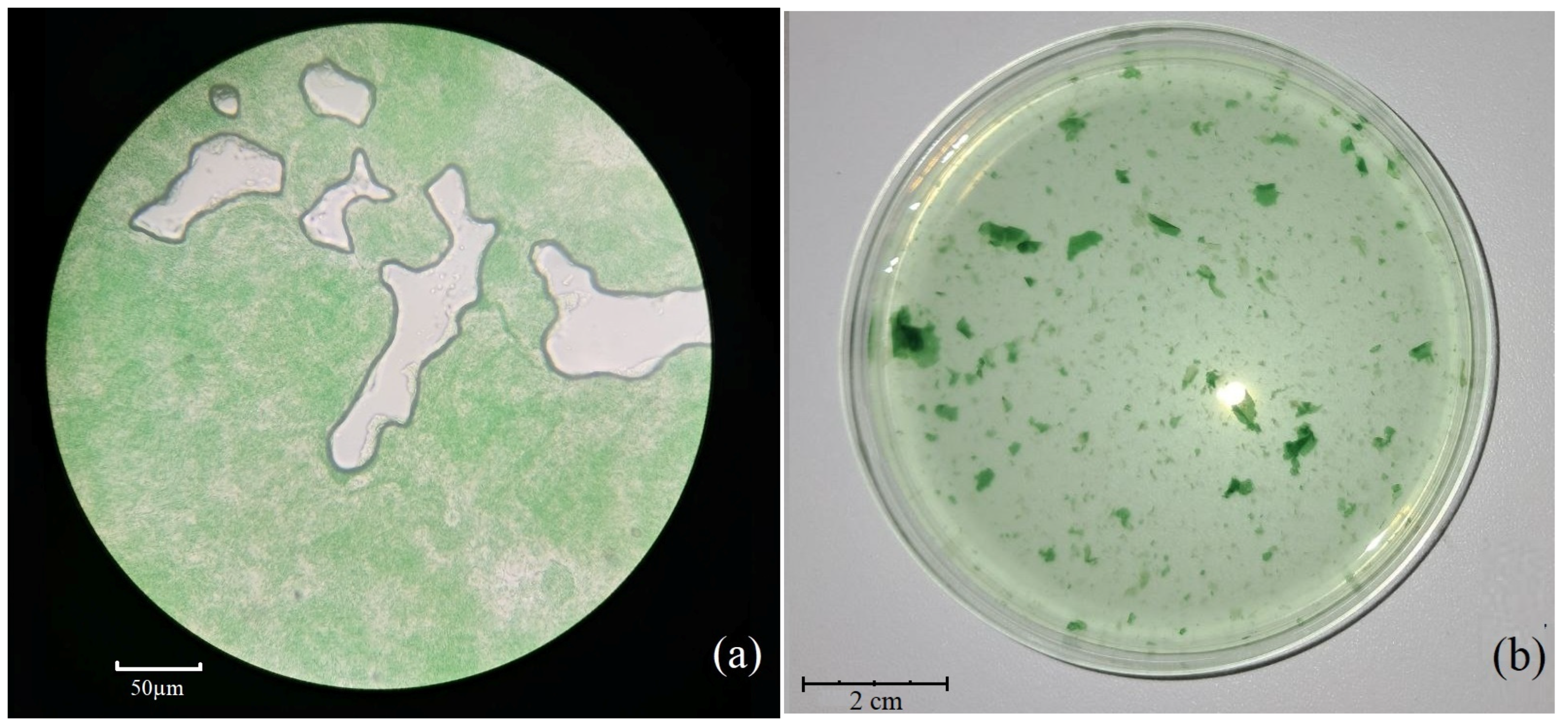 Figure 1b, the macrostructure of algae is shown at the scale visible to the naked eye in a Petri dish, displaying the overall appearance, spatial distribution, and clumping of algal biomass. This reflects the large-scale form and organization of the culture.