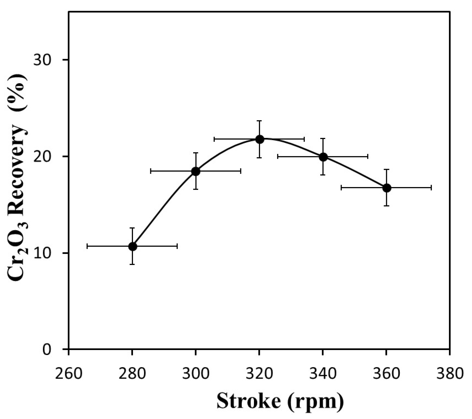 3 recovery ranged from 10% to 22%, highlighting the significant influence of stroke on separation performance. At the lowest stroke rate of 280 rpm, the shaking action was insufficient to promote effective stratification of the dense chromite particles behind the riffles. Consequently, these particles were entrained into the middling zone and mixed with gangue minerals (primarily olivine) due to the scavenging effect of the wash water, resulting in the lowest recovery of approximately 10%.
