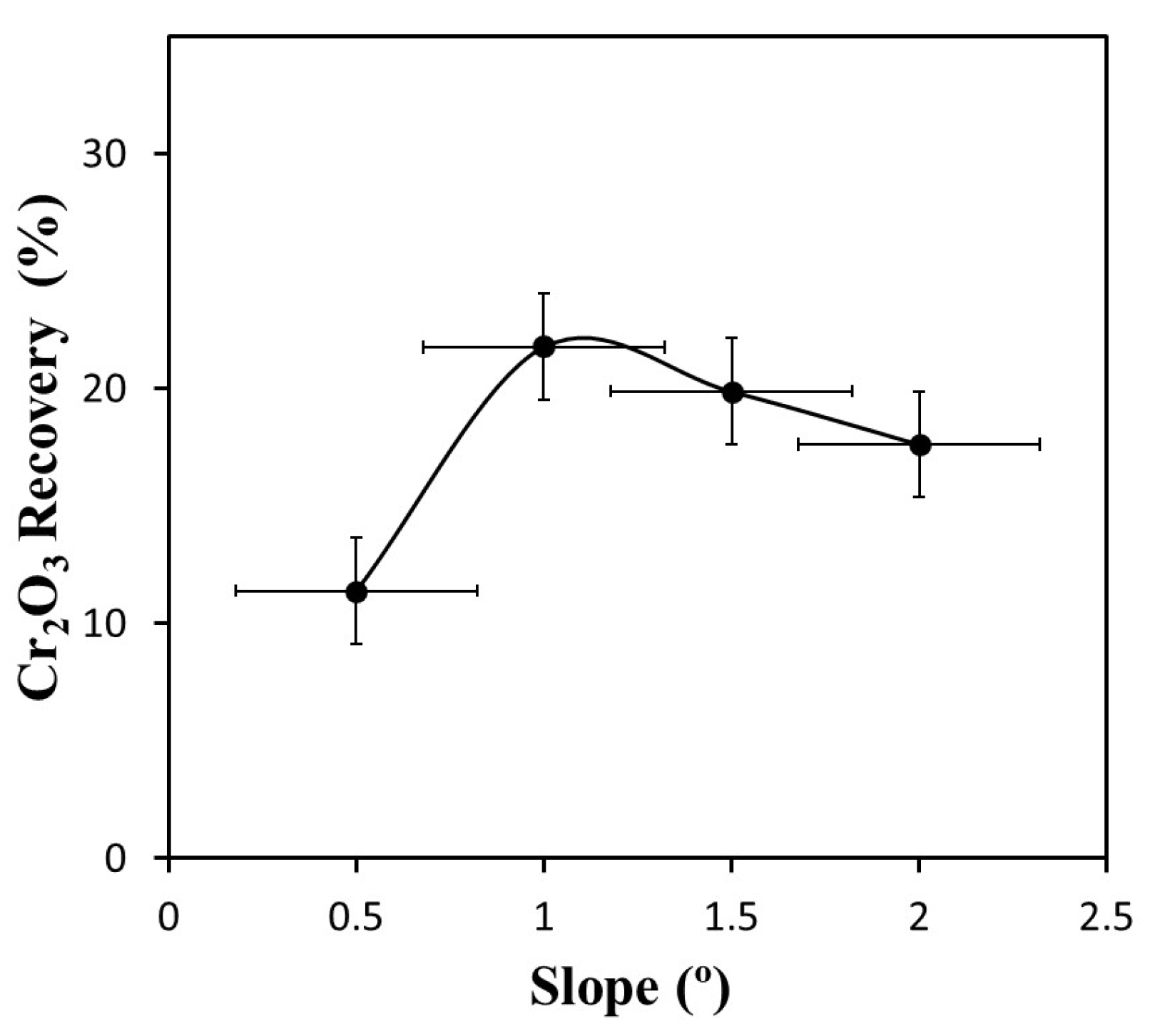 The results demonstrated a clear influence of deck slope on chromite recovery from tailings. At the minimal slope of 0.5°, reduced water flow and increased water thickness hindered effective stratification, causing chromite particles to move irregularly and mix with gangue in the reject zone, resulting in Cr2O3 recovery of below 11.5%. Increasing the slope to 1° enhanced stratification behind the riffles, promoting more efficient transport of chromite particles to the concentrate zone and yielding recovery values exceeding 20%. However, further increases in slope to 1.5° and 2.0° accelerated water flow, displacing additional gangue minerals toward the reject zone. Although these steeper slopes produced higher concentrate grades, the separation bands became narrower, rendering the process more sensitive to minor variations during concentrate collection, which could significantly affect final concentrate quality.