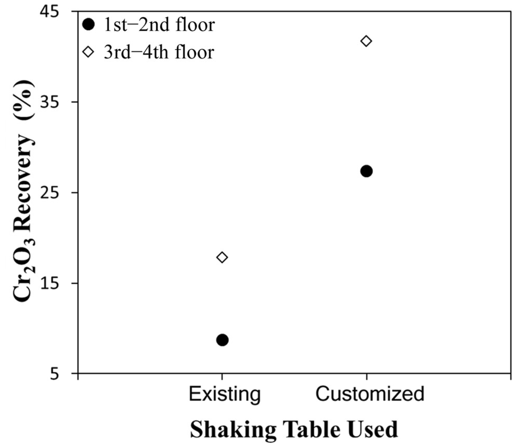 When evaluating the recovery of marketable-grade chromite concentrate from the middlings of the 1st and 2nd floor tables, the 3rd and 4th floor shaking tables under existing plant conditions achieved only approximately 17% Cr2O3 recovery. In contrast, reprocessing these middlings using the custom-designed shaking table substantially increased recovery to over 40%. This result underscores the critical role of tailored equipment design in capturing chromite particles that would otherwise remain unextracted and emphasizes the potential of customized solutions to improve mineral utilization and promote more sustainable processing practices.