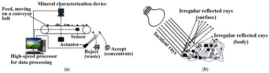 Due to technological advancements, automatic sorters (electronic sorters) were developed to discriminate targeted minerals from gangue. Electronic mineral sorting (using electronic sensors) became a reality in the early 1970s [8]. Such automatic sorters include sensors connected with programmable high-speed processors to identify and sort targeted minerals from the gangues (Figure 1a) using predefined criteria, such as density, conductivity, diffusivity, color, texture, dielectric, magnetic and radioactivity properties of the ore [9]. The electronic sensors detect mineral-specific properties under different electromagnetic (EM) waves, including radio, infrared, light, ultraviolet, X-ray and gamma-ray, allowing for classification and separation of target elements/minerals from gangue. Different sensors for ore sorting, however, work at various ranges of the electromagnetic spectrum (Table 1), and their effectiveness depends on many factors, such as material properties, distribution of minerals/elements among particles, sensor selectivity, and economic considerations for sustainable mining [10]. Detected ore particles are classified into target minerals, intermediate products, and waste by an interpreter and electro-mechanical sorting device [11], facilitating ore pre-concentration.