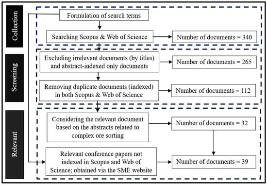 Ore sorting has been a hot topic in the literature for decades [8]. Researchers used different terminologies to represent the process, including “ore sorting”, “sensor-based sorting”, and “electronic ore sorting”. To gather scattered published work (only documents published in English were considered) and established terminologies in the literature on ore sorting technology, “electronic ore sorting” was searched using Scopus and Web of Science (WoS) databases—comprehensive and trusted citation databases mostly used for review works [5]. The methodology employed for literature acquisition is presented in Figure 2. Due to different terminologies used in the literature, various search terms were employed to acquire documents for this study. The “electronic ore sorting” was searched using the Scopus database. This produced only two documents. When the search term was changed to electronic AND “ore sorting”, the number of documents increased to three. Automatic AND “ore sorting” was also searched using the same database, producing five documents. Then we changed the search term to sensor-based AND “ore sorting”, which produced 43 documents. To obtain more documents, we refined the search term to “ore sorting,” which yielded 178 documents. Since “ore sorting” produced the highest number of documents in the Scopus database, the term was used to find documents using the WoS. The total documents obtained using Scopus and WoS databases, conference papers, and screening criteria are presented in Figure 2. While 39 documents primarily related to sorting complex ores were identified, additional industrial case studies and published results from ore sensor manufacturers were also included in the critical review.