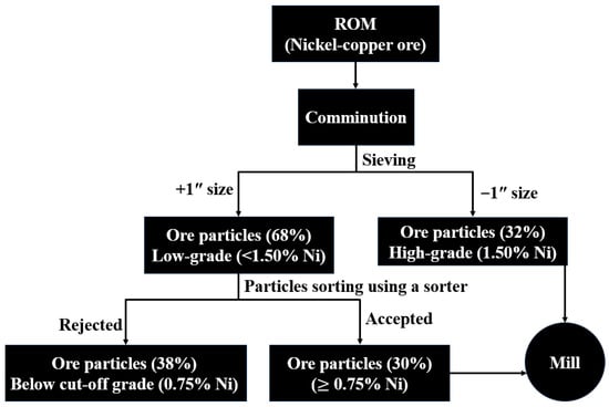 In another study, magnetic separation was employed to sort complex sulfide particles acquired from Whistle Mine, achieving a waste rejection rate of 38% (Figure 3). Processing this waste alongside targeted minerals would have led to increased operational costs due to unnecessary handling and treatment. Pre-concentration of the complex ore from Whistle Mine improved both nickel and copper recovery during downstream operations [79]. Electromagnetic sorting of nickel has also been reported. This automated sorting process uses sensors to detect particles as they are fed through the system. Scan and air reject units, then separate the material into two streams high-grade Ni (accept) and low-grade Ni (reject). The low-grade fraction can be further processed through comminution, followed by an additional round of electromagnetic sorting [80]. The use of ML may improve the sorting operation. The application of ML to multi-sensor nickel ore sorting was studied [72]. Two sensors were considered: MW-IR and XRT. The acquired data from both sensors was preprocessed, with Tensorflow used for object detection and segmentation of XRT data, while k-means clustering (pixel-wise quantification) was employed for the MW-IR data. Statistical analysis was then performed for feature extraction and to determine the intrinsic sortability. Logistic regression was then used to predict sorting performance under three scenarios: XRT only, MW-IR only, and combined multi-sensor. Findings indicated that the multi-sensor approach performed better than a single sensor for sorting targeted mineral (nickel) from gangue. At a mass recovery of 72.82%, the nickel recovery reached 99.89%, with the ML model achieving an accuracy of 0.976, with an absolute error of 0.023 [72].