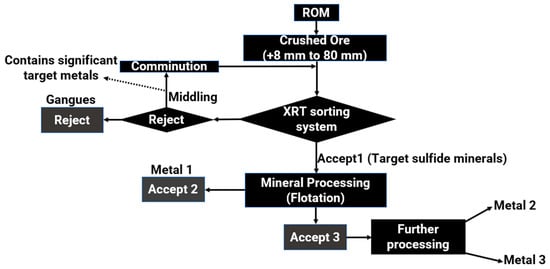 In another study, the amenability of silicate-zinc ore to XRT sorting was conducted and compared to other pre-concentration methods, such as heavy medium separation (HMS) and jig stratification [81]. XRT sorting achieved 93% recovery with a 30% waste rejection rate (particle size ranges: −50 + 19 mm and −25 + 8 mm). Under the same rejection rate, HMS (particle size range: −25 + 1.18 mm) achieved 97% Zn recovery, suggesting some Zn loss in XRT sorting [81]. A detailed techno-economic analysis is necessary to compare these approaches, considering all parameters, including water management associated with the HMS approach. Figure 4 illustrates a strategy used for sorting sulfide ore, containing copper, zinc, and lead, using an XRT sensor. This approach can upgrade copper grade by 20% to 100% while rejecting 20% to 45% of the material as waste [82]. The extent of metal recovery at different processing stages depends on the initial ore grade, flotation parameters, and techniques used.
