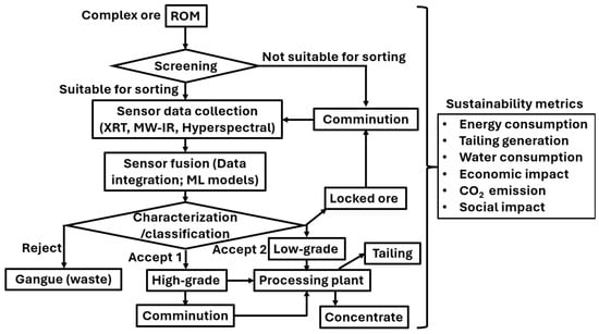 The proposed framework (Figure 5), if properly developed, will likely reduce the impact of ore variability on the characterization and sorting process, using innovative sensor fusion technology. The sustainability (key performance indicators: KPIs) of the proposed technology should be evaluated based on the reduction in energy and water consumption, CO2 emission, economic and social impact, and tailing reduction resulting from the implementation of the proposed technology.