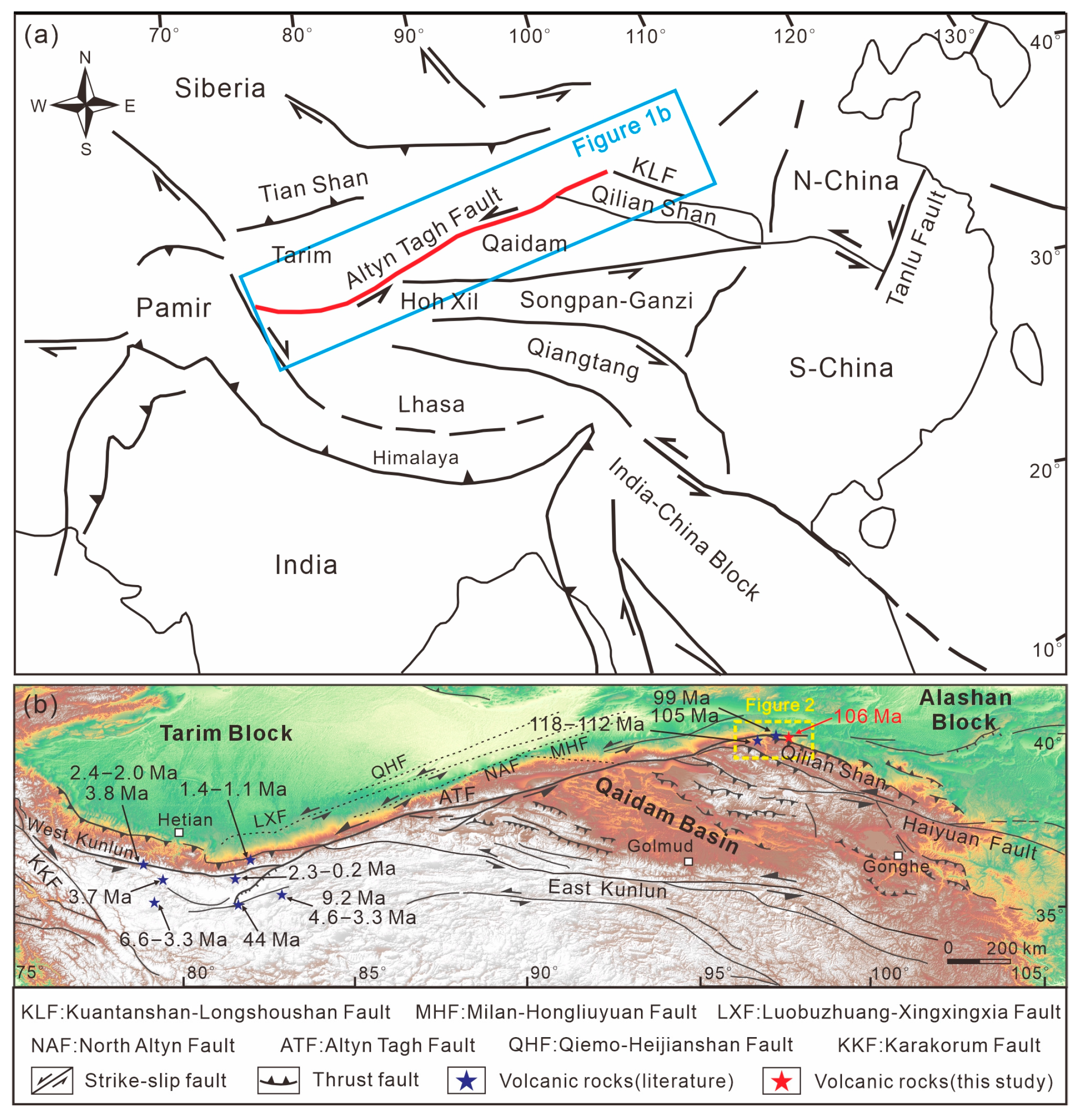 - Dai, S.; Dai, W.; Zhao, Z.B.; Luo, J.H.; Qiang, L.; Ma, X.; Zhang, X.W.; Xu, J.J. Timing, displacement and growth pattern of the Altyn Tagh fault: A review. Acta Geol. Sin.-Engl. Ed. 2017, 91, 669–687. [Google Scholar] [CrossRef]