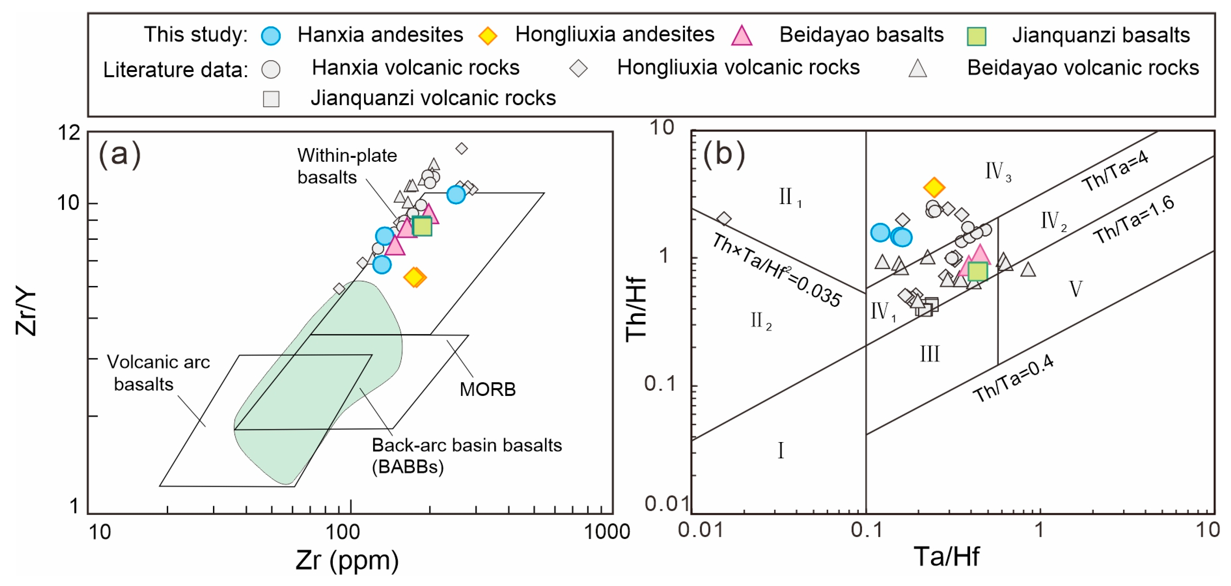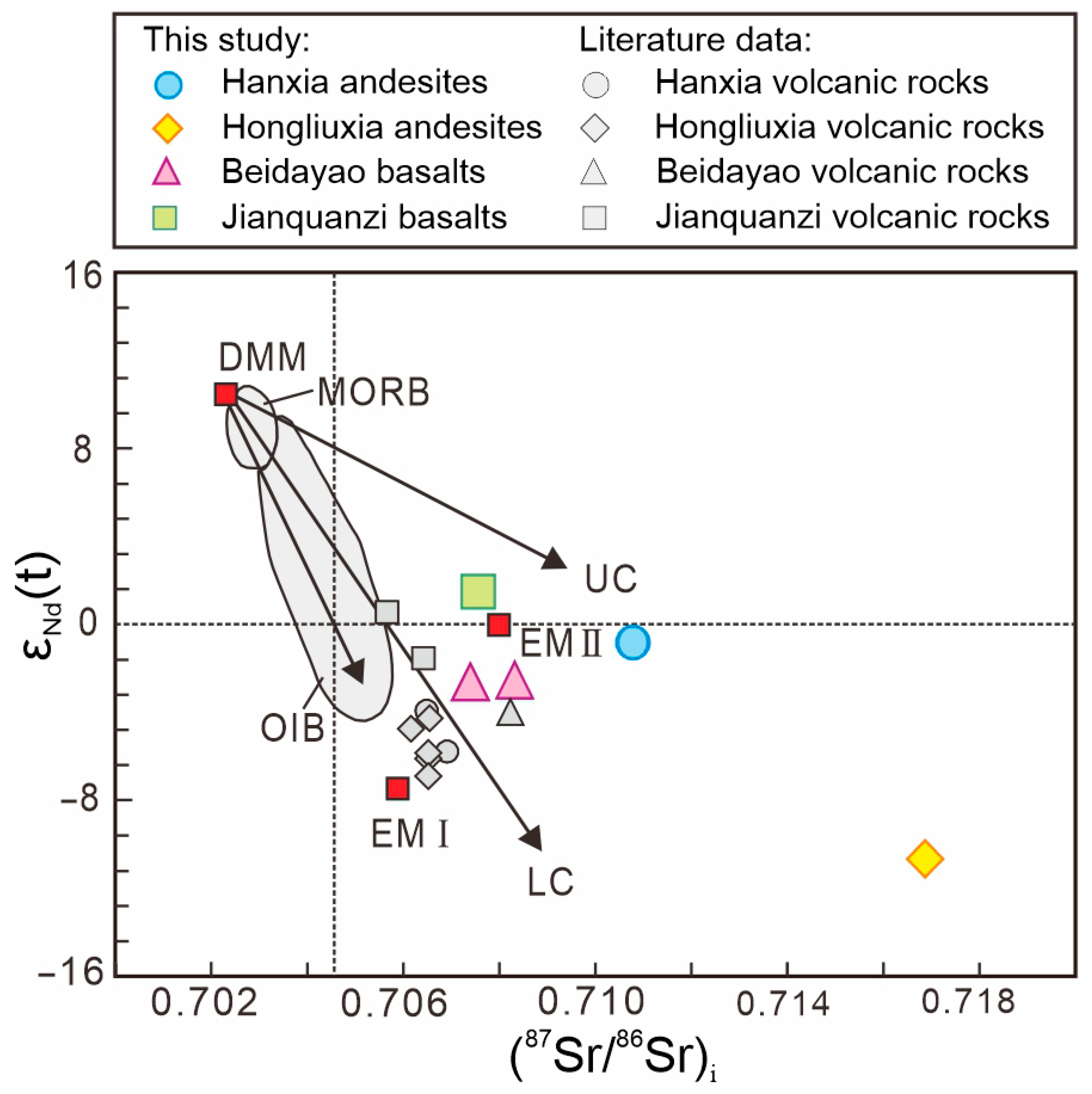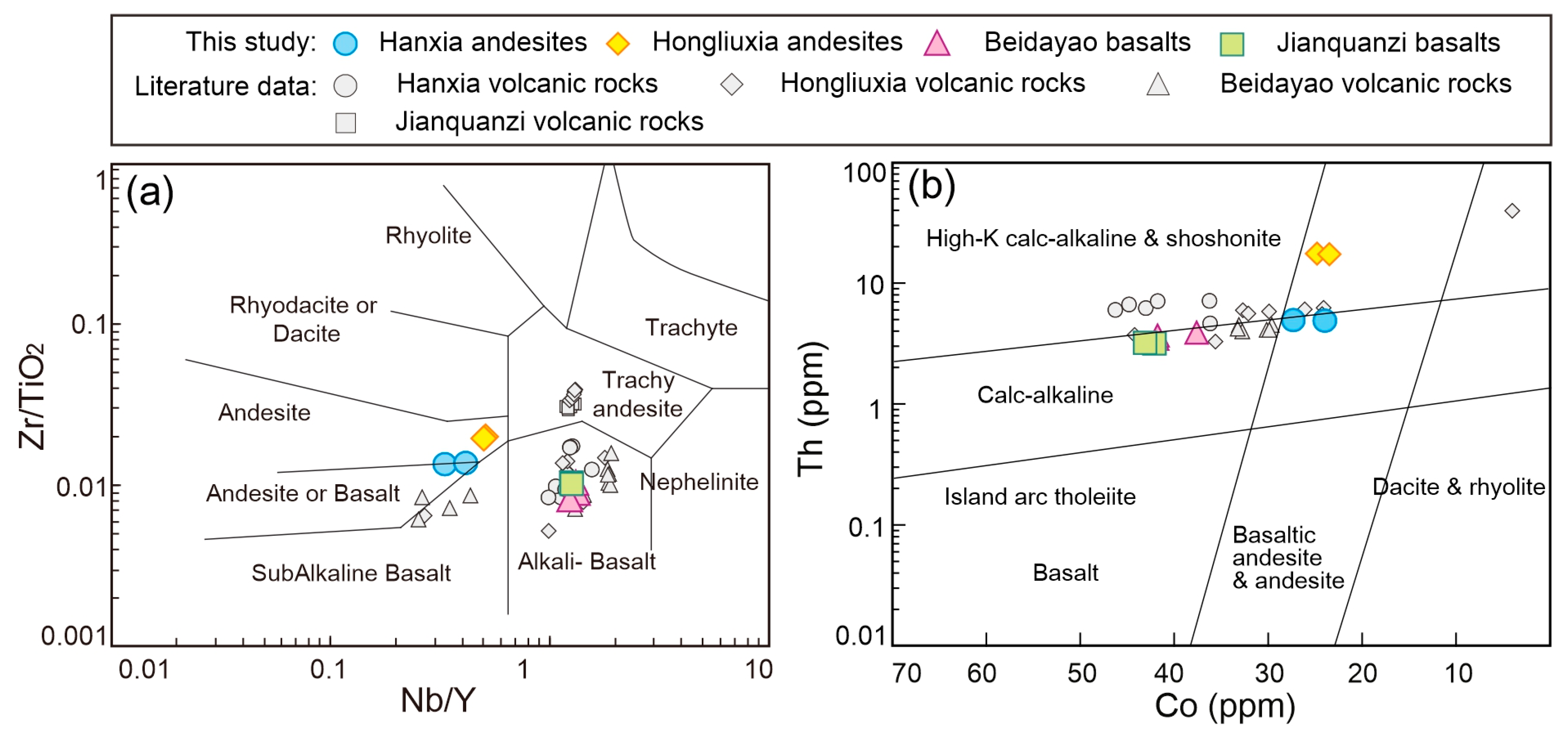 - The andesites from Hanxia and Hongliuxia in the eastern study area show trace element patterns characteristic of Continental Arc Andesites. This indicates their derivation from the partial melting of a mantle wedge that had been metasomatized by sediment-derived melts, followed by probable fractional crystallization involving olivine, clinopyroxene, and plagioclase.
