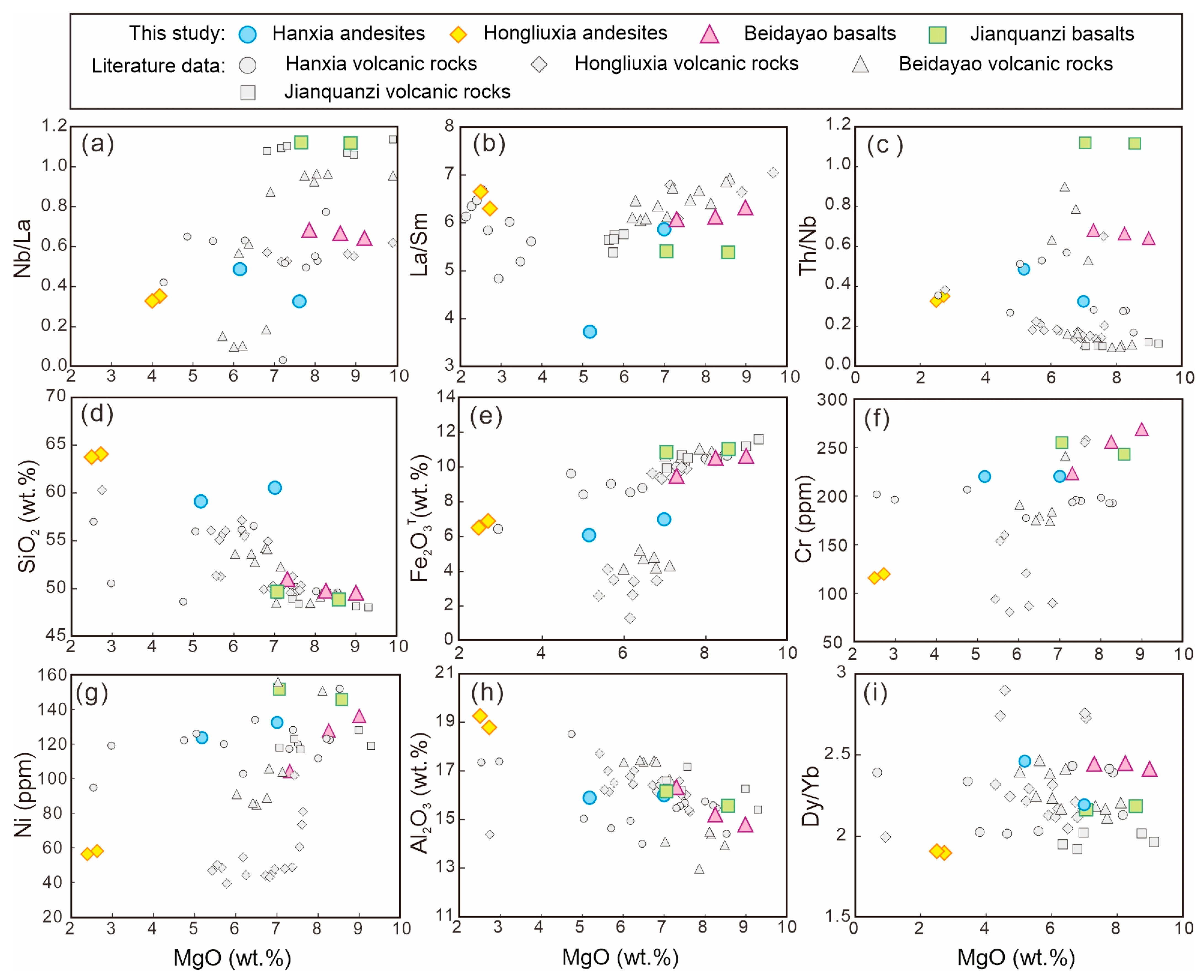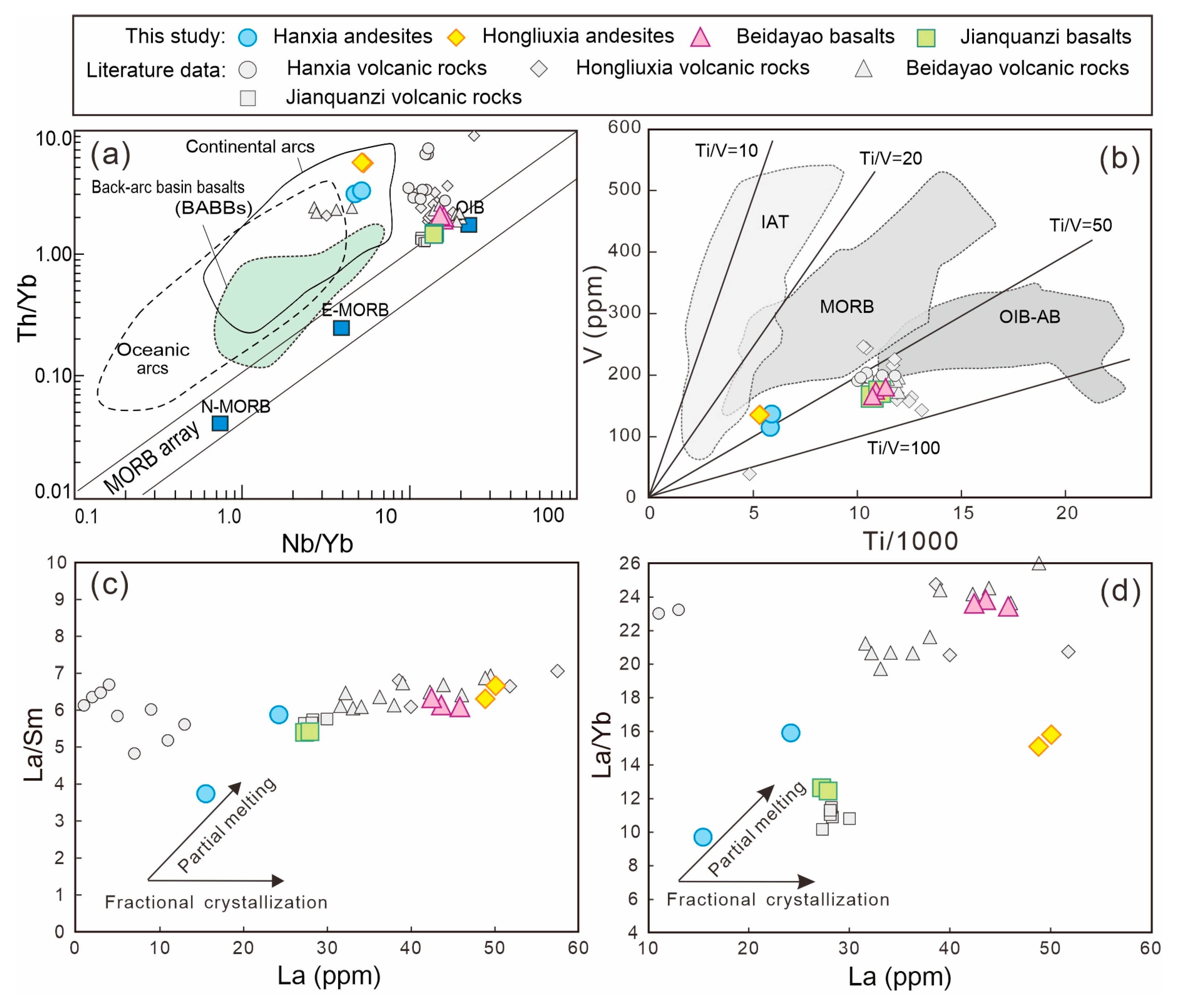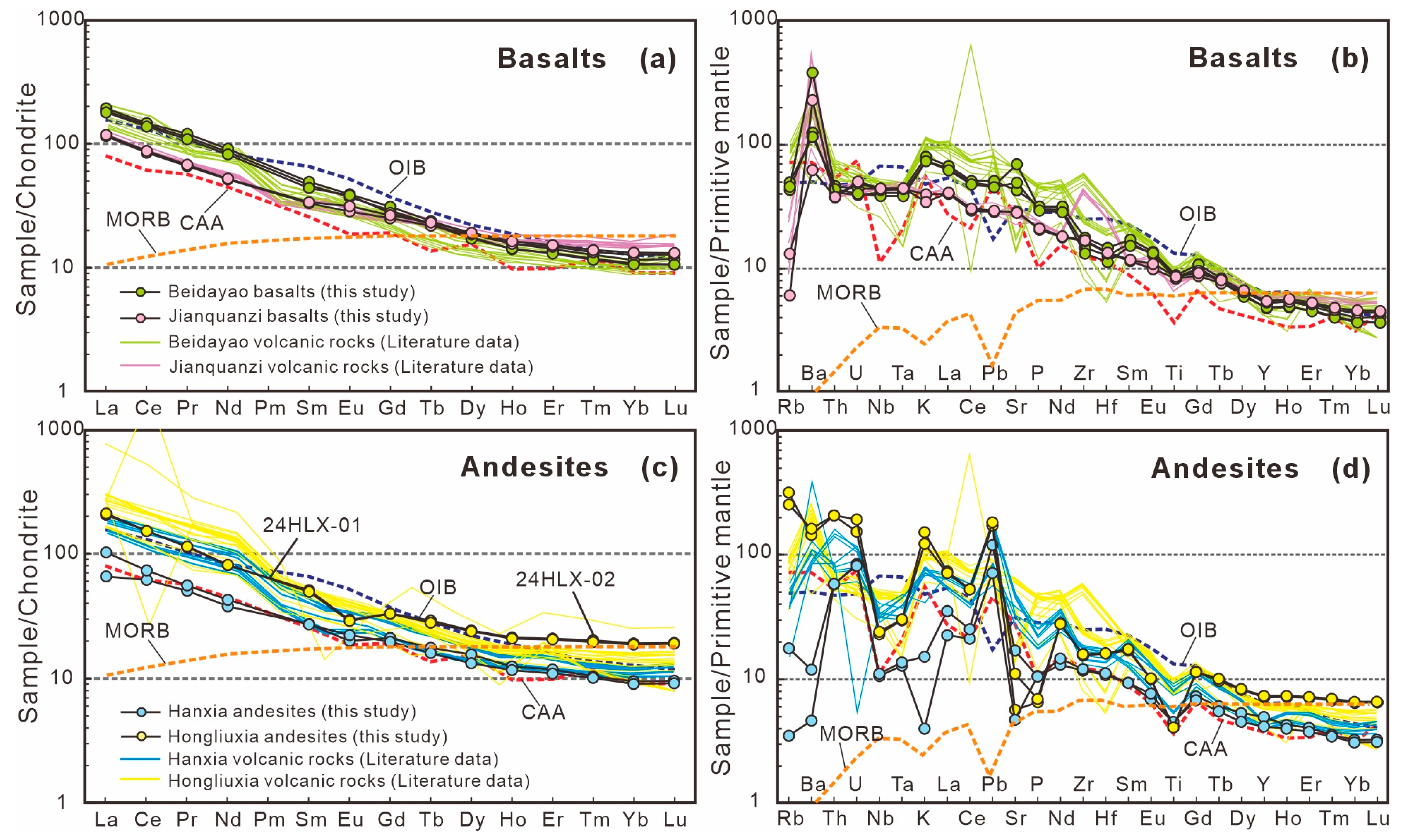 - The andesites from Hanxia and Hongliuxia in the eastern study area show trace element patterns characteristic of Continental Arc Andesites. This indicates their derivation from the partial melting of a mantle wedge that had been metasomatized by sediment-derived melts, followed by probable fractional crystallization involving olivine, clinopyroxene, and plagioclase.