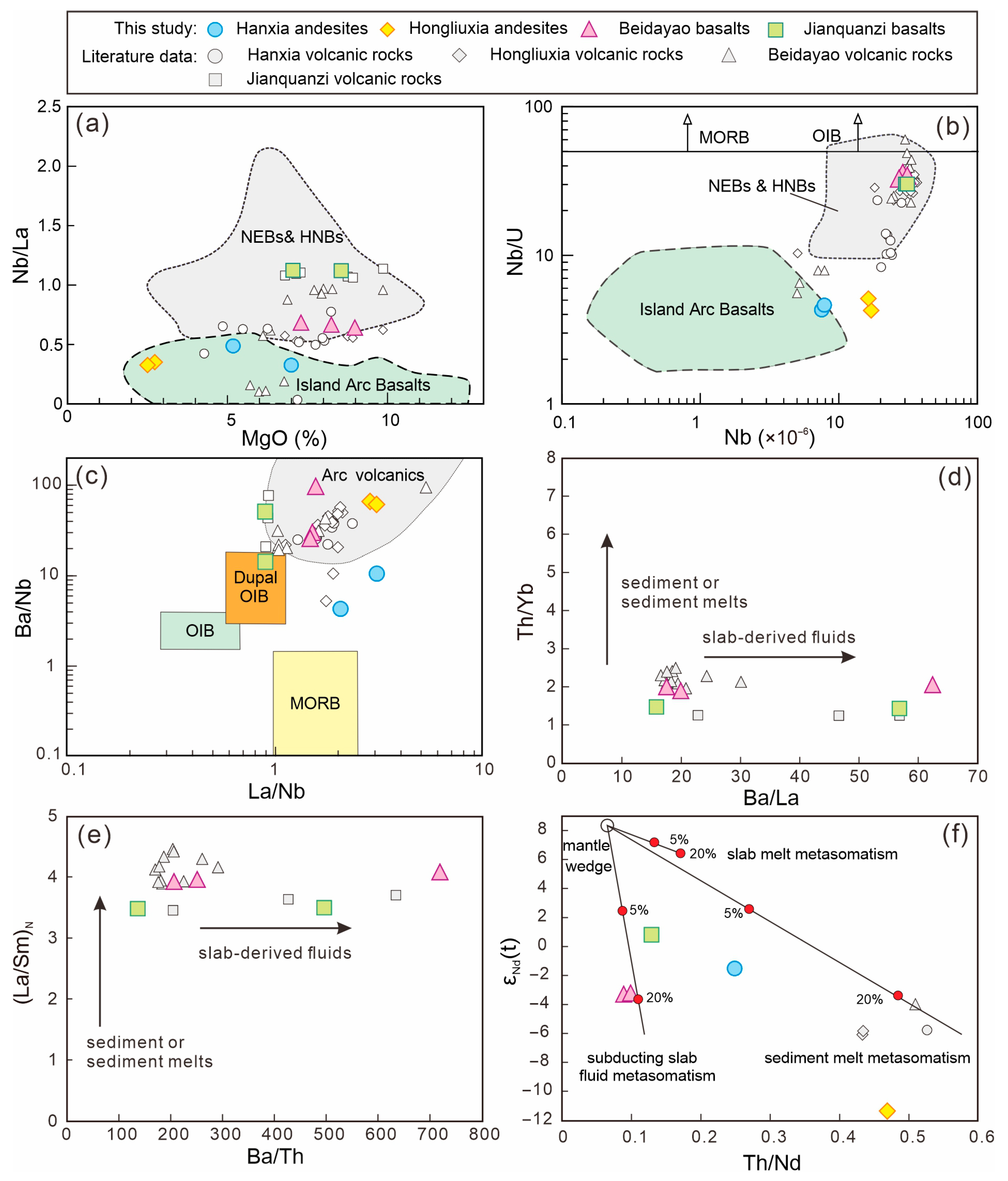 - The OIB-type geochemical signature observed in the Nb-enriched basalts (Nb > 20 ppm) from Jianquanzi and Beidayao in the western study area is interpreted as originating from partial melting of an enriched mantle wedge, which was metasomatized by slab-derived fluids with a contribution from the asthenospheric mantle. Magmas from this source region probably underwent fractional crystallization of olivine and clinopyroxene without significant crustal contamination.