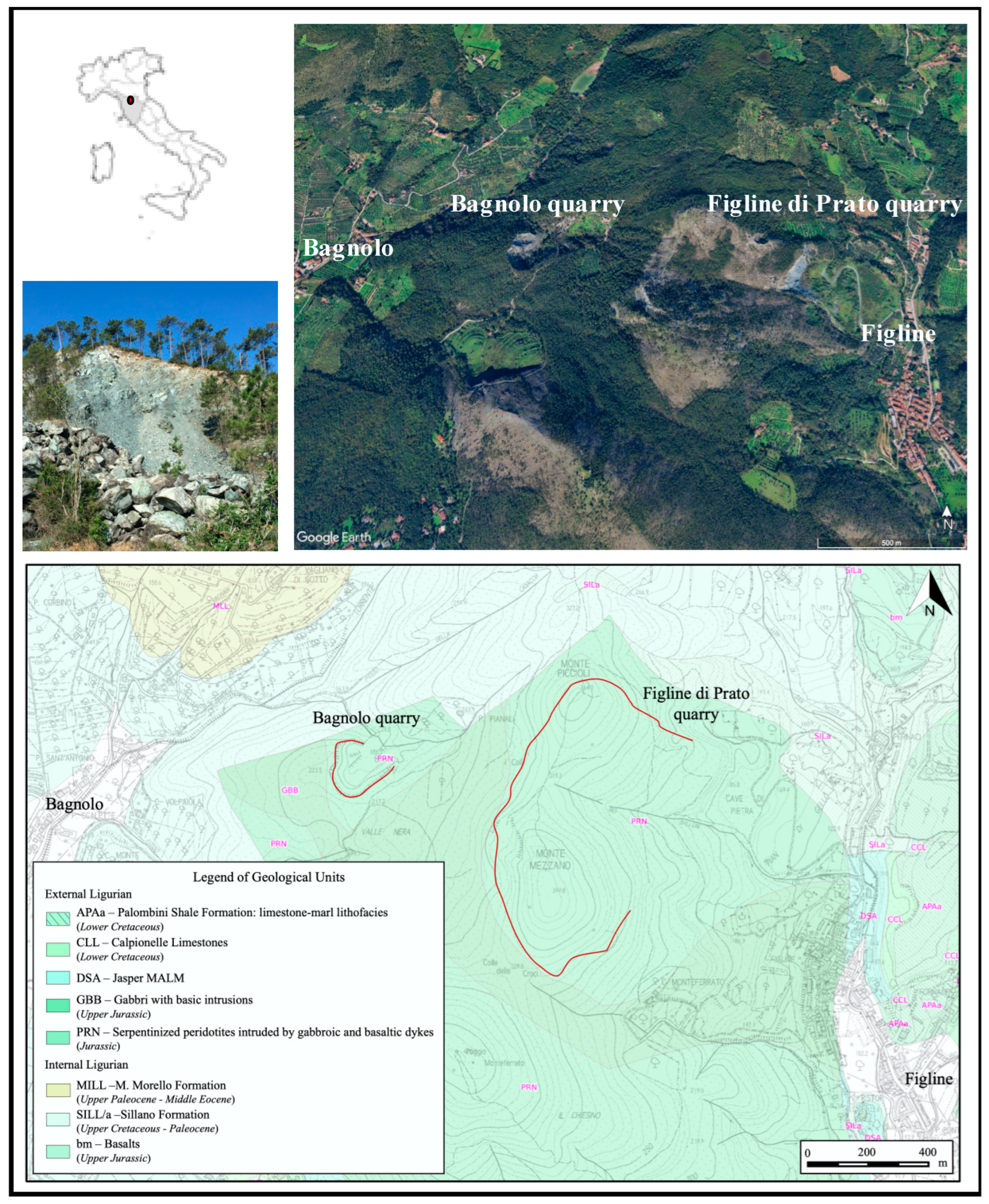 - Coli, M.; Compagnoni, R.; Cossio, R.; Del Ventisette, C.; Vannucchi, P. The Monteferrato Serpentinized Peridotite (Figline di Prato, Prato) in the Northern Apennines, Italy: A Witness Of The Ligurian Ocean Margin in the Monumental Religious Buildings of Tuscany. Ofioliti 2023, 48, 105–120. [Google Scholar]