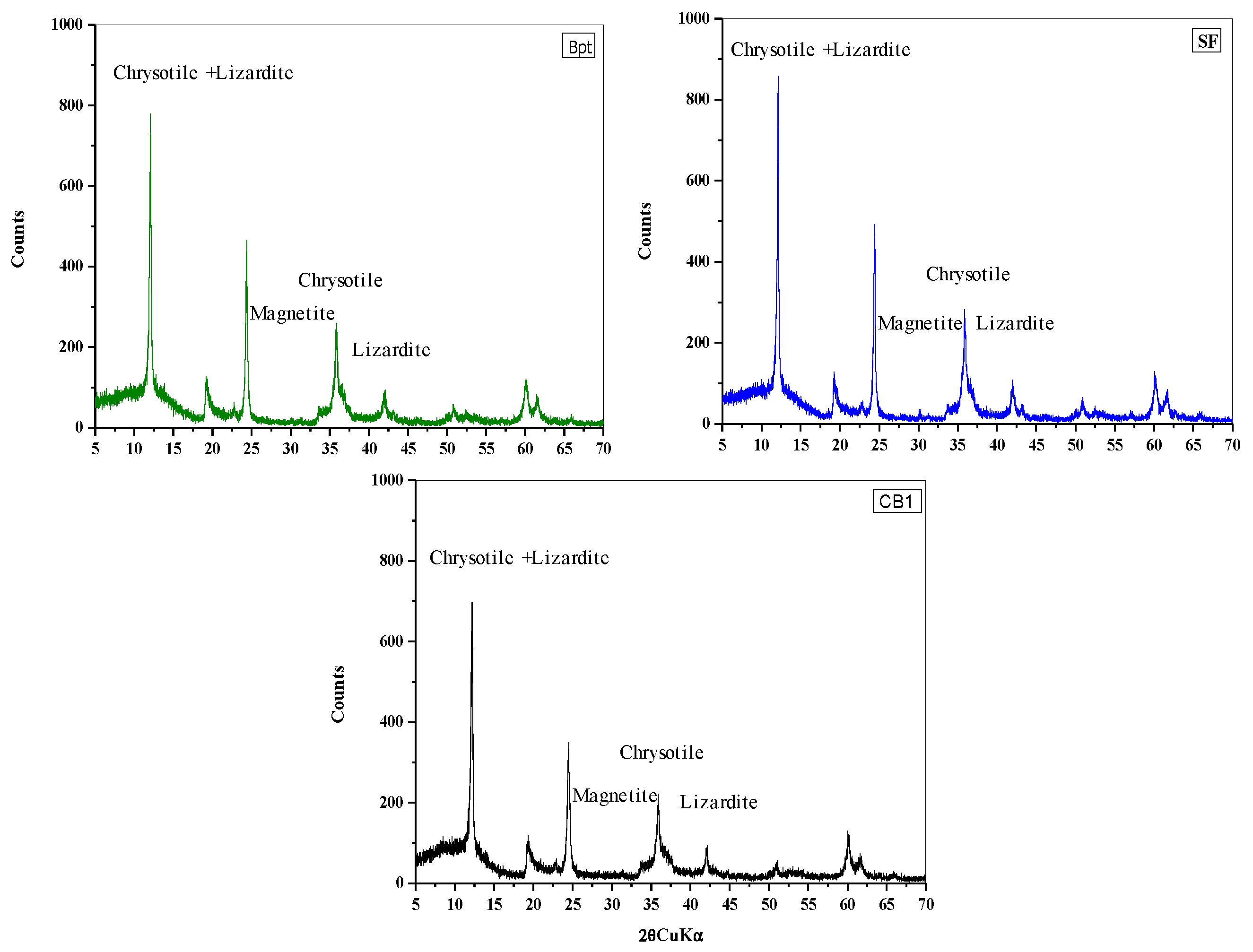 - Marzini, L.; Iannini, M.; Giorgetti, G.; Bonciani, F.; Conti, P.; Salvini, R.; Viti, C. Asbestos Hazard in Serpentinite Rocks: Influence of Mineralogical and Structural Characteristics on Fiber Potential Release. Geosciences 2024, 14, 210. [Google Scholar] [CrossRef]