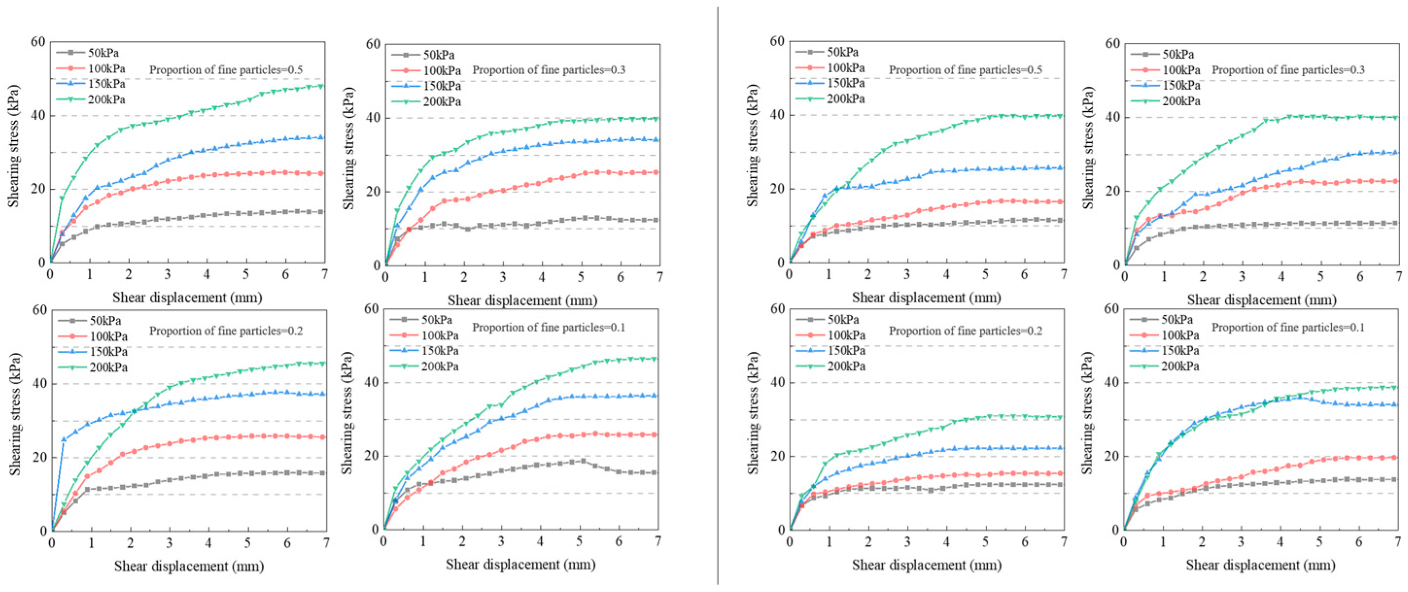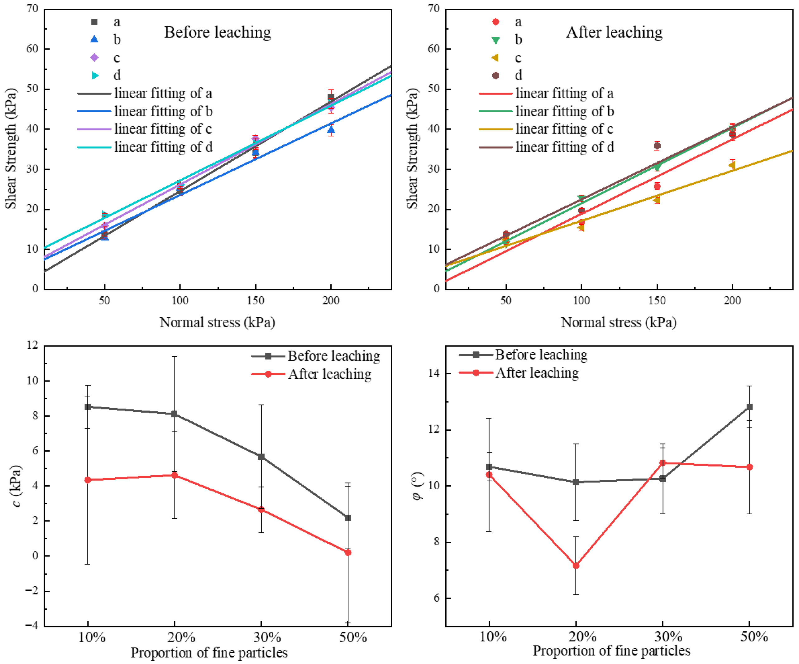 Figure 3. After leaching, the curves’ initial stages were generally flatter, especially for the b and c groups, showing looser particle bonds. Additionally, the shear strength was weakened under each proportion of fine particles. Group b had the most significant drop. At the start of the tests, closely packed soil particles with high friction and interlocking caused shear stress to rise quickly. As shear displacement increased, particle movement and reorganization formed a stable sliding surface, slowing the stress rise. After reaching peak strength, particles were still interlocked, bearing some shear force. Residual stress stabilized with minor fluctuations.