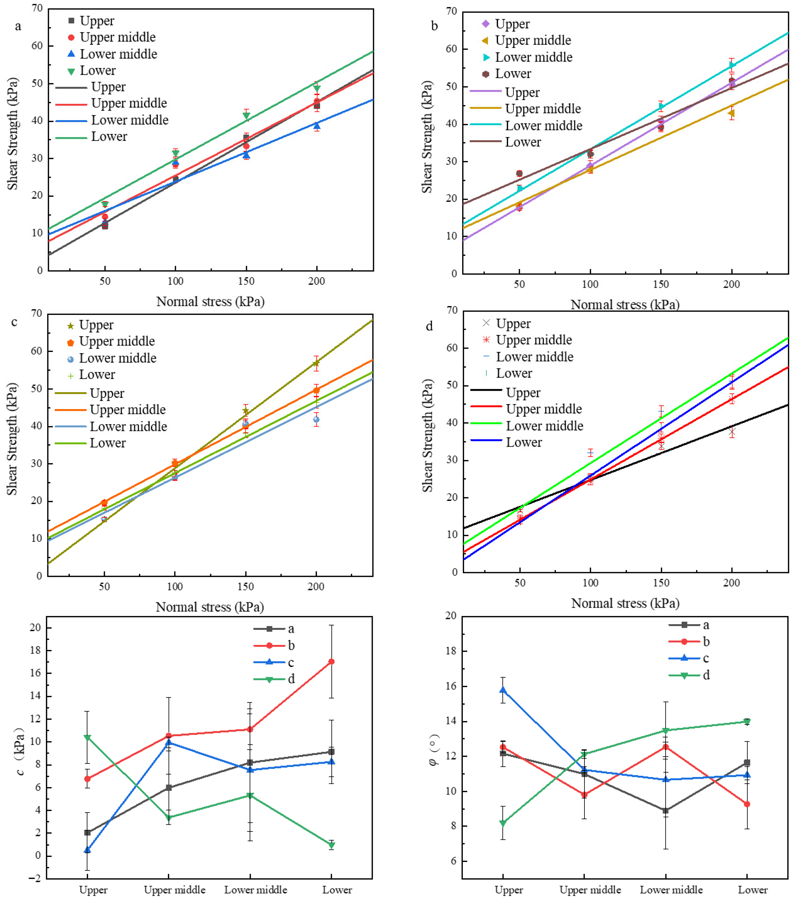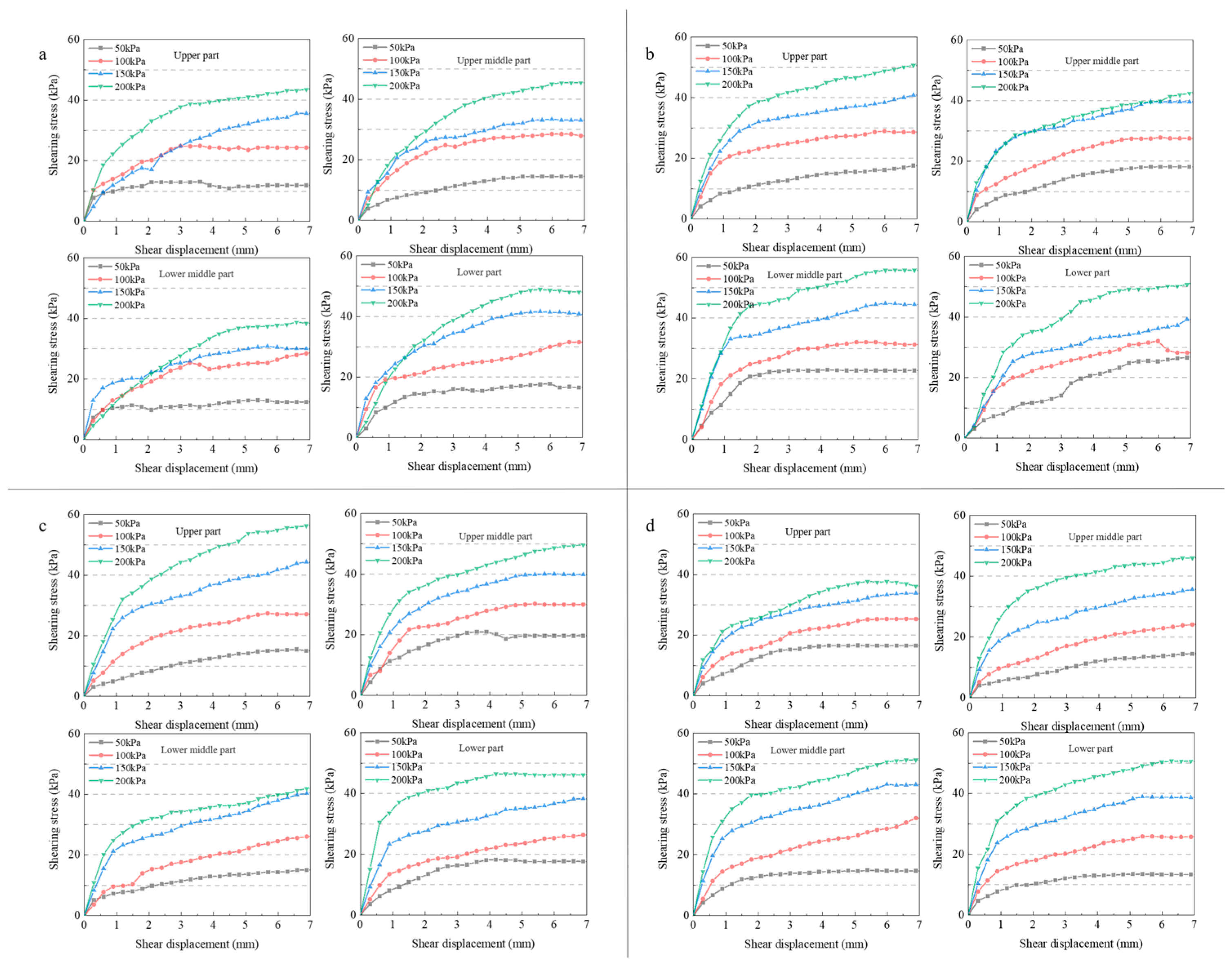 Shear tests were performed on four groups of ore samples with different burial depths after leaching. In this study, upper, upper middle, lower middle, and lower were defined as depths of 20–60 mm, 60–100 mm, 100–140 mm, and 140–180 mm, respectively. The shear stress–displacement curves were obtained, as shown in