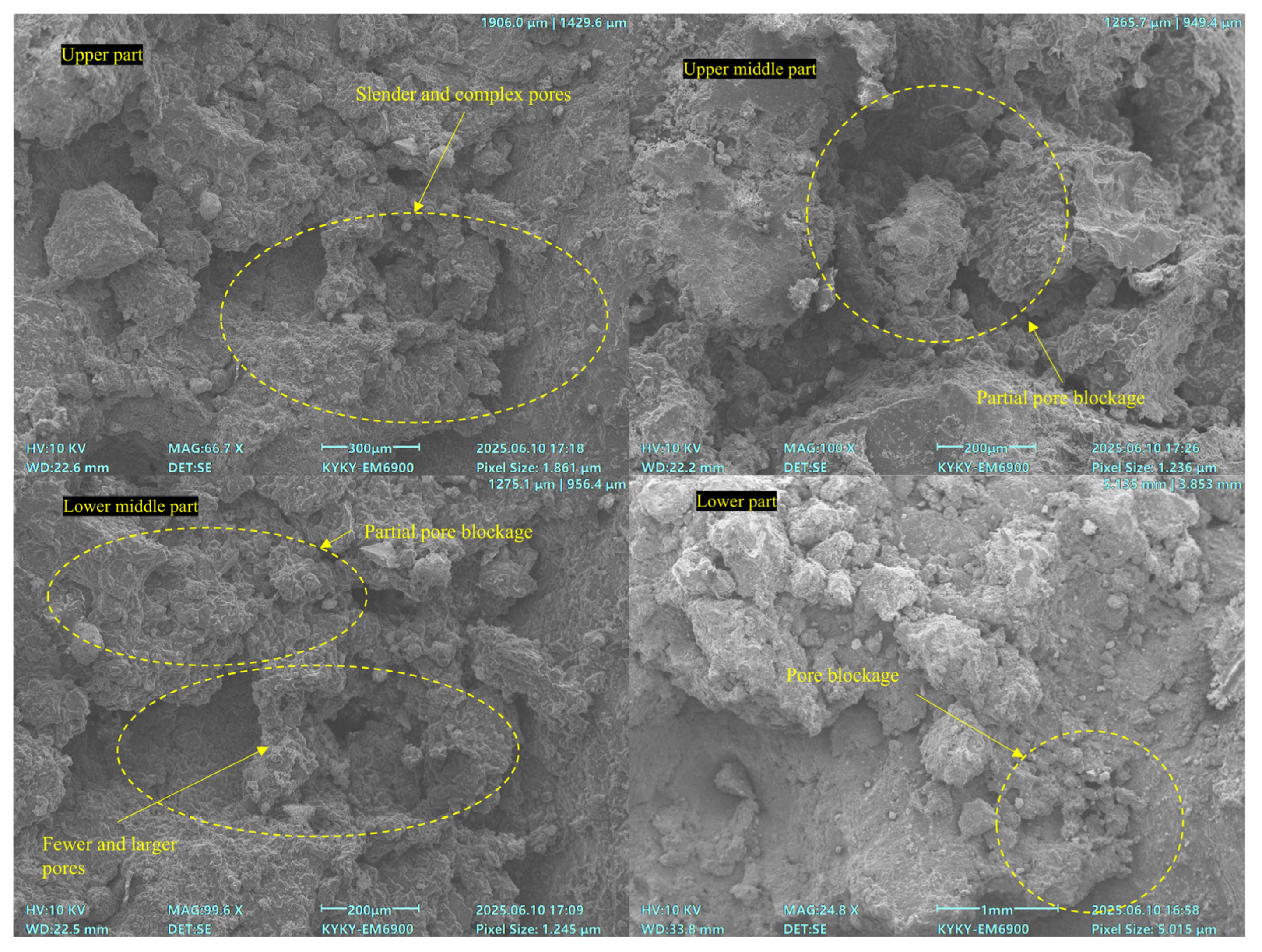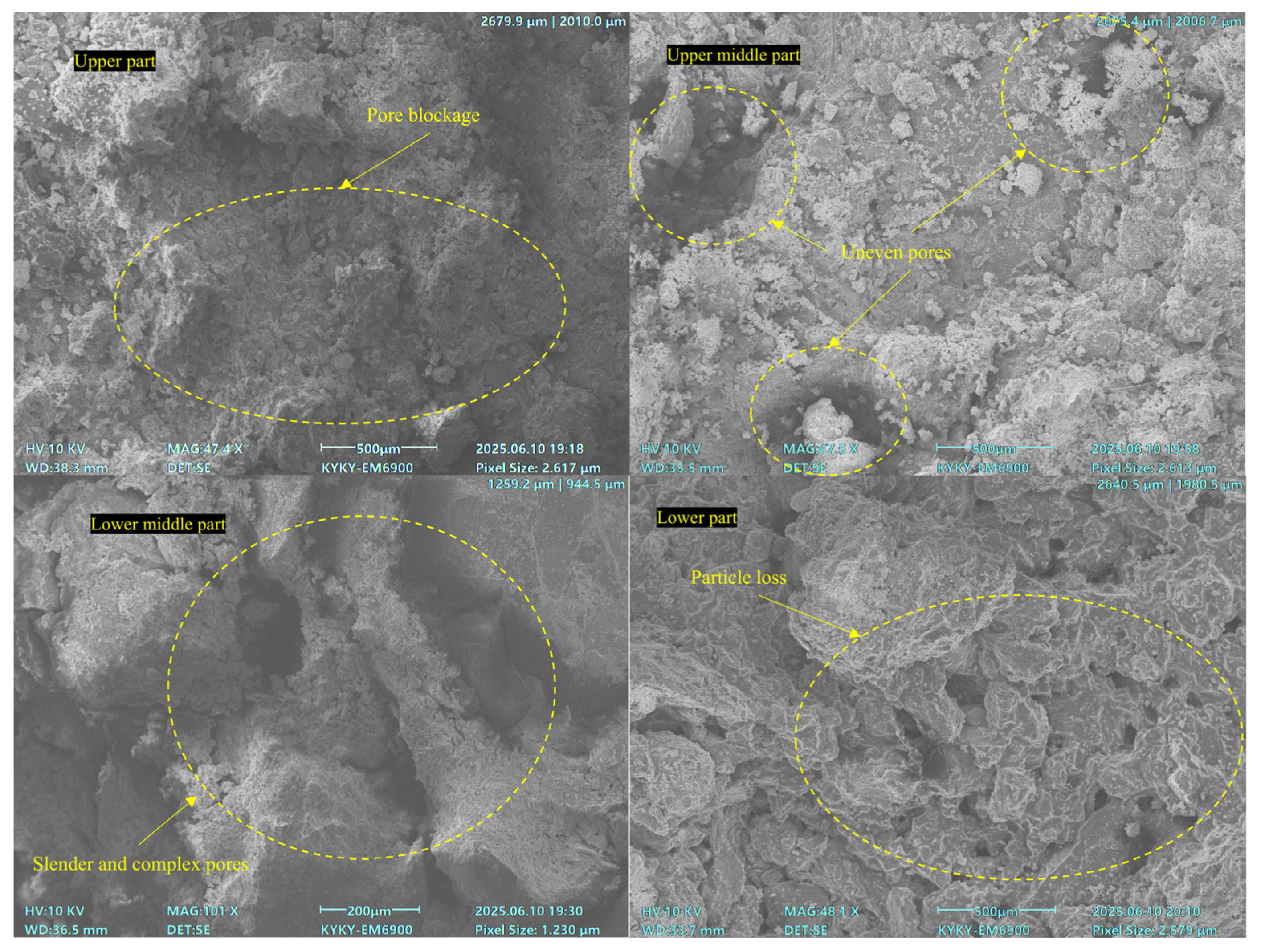Figure 10), the upper part had more tiny and dense particles with a uniform pore structure and clogging. The upper middle part had uneven pore distribution, making it hard to maintain