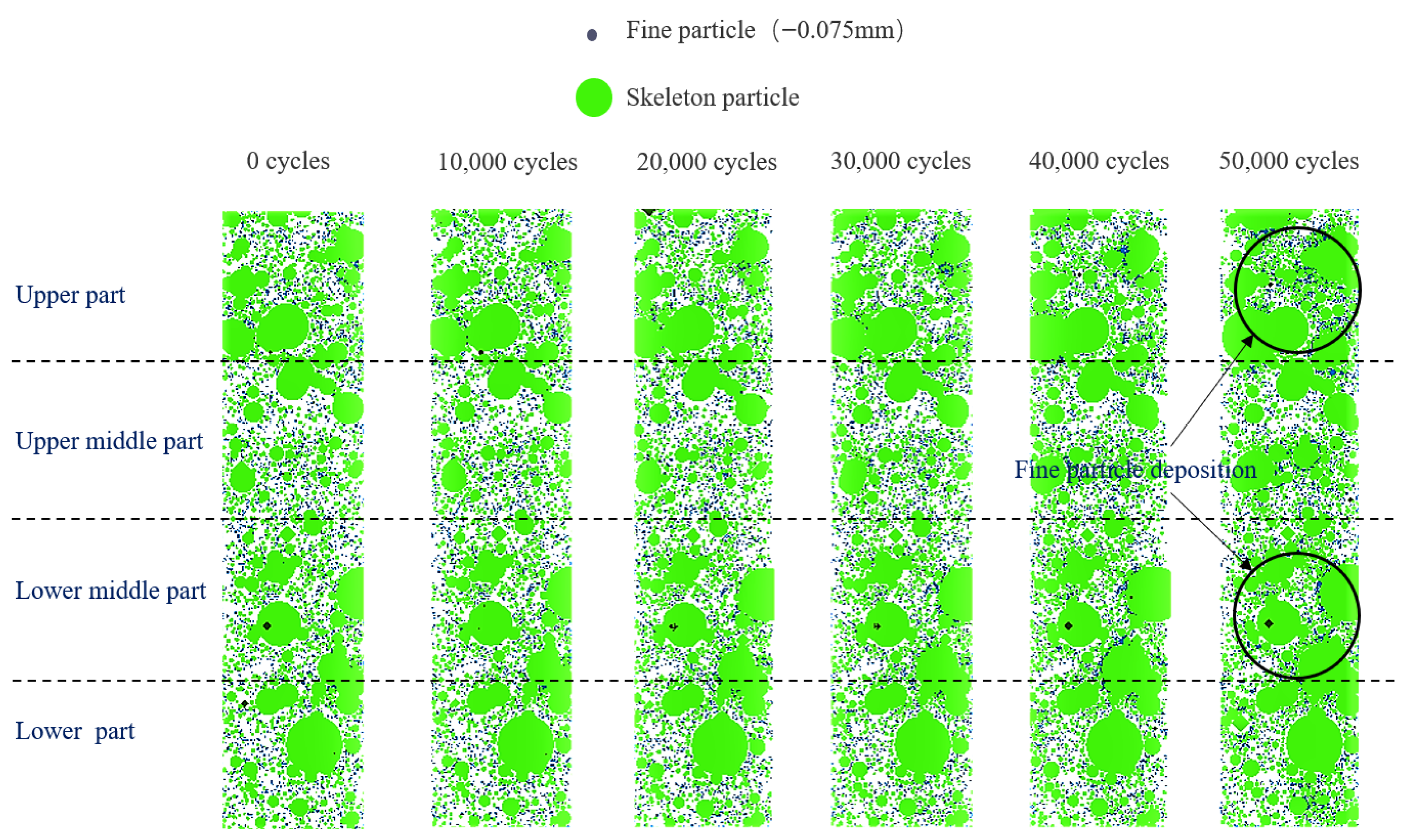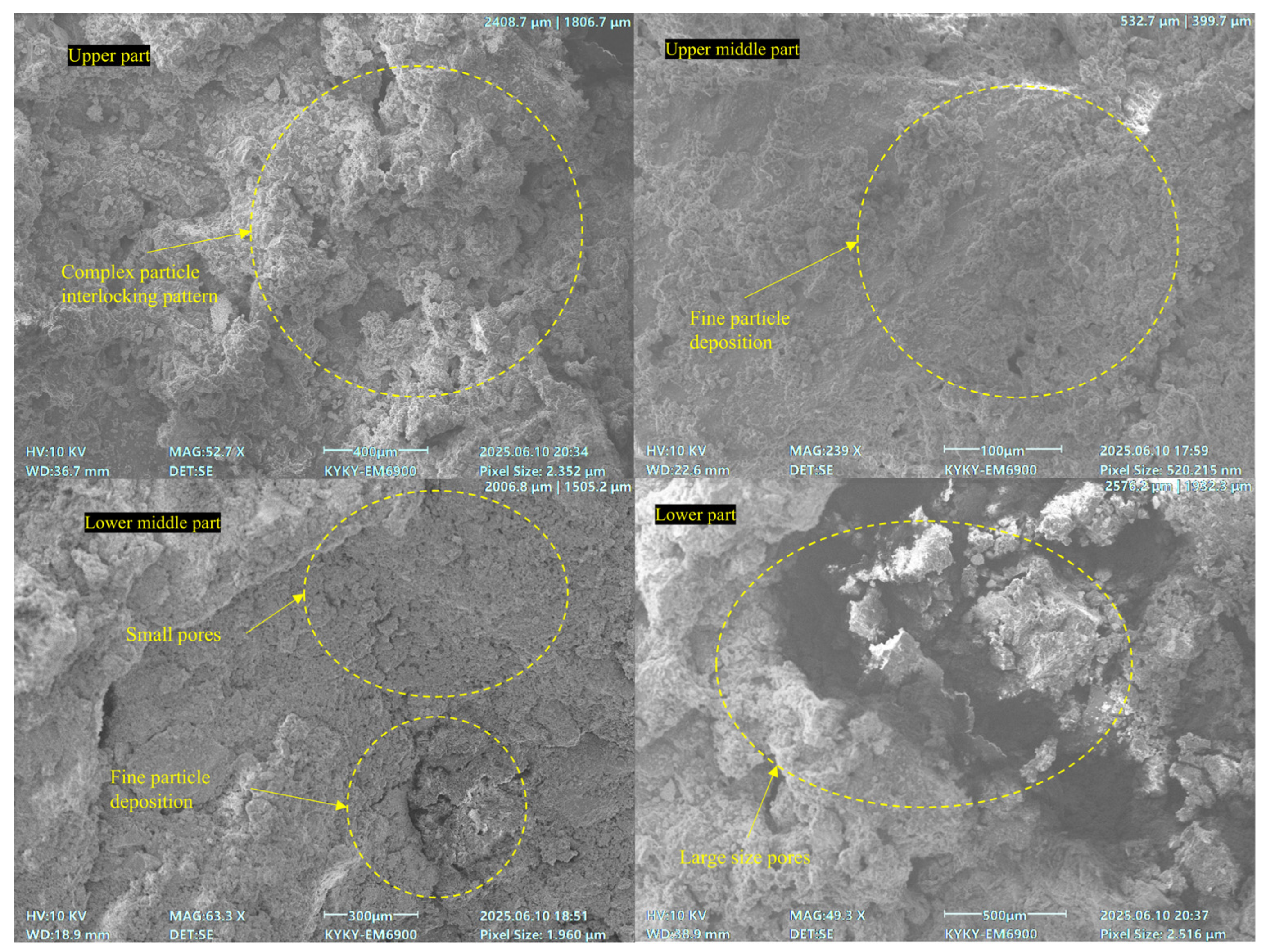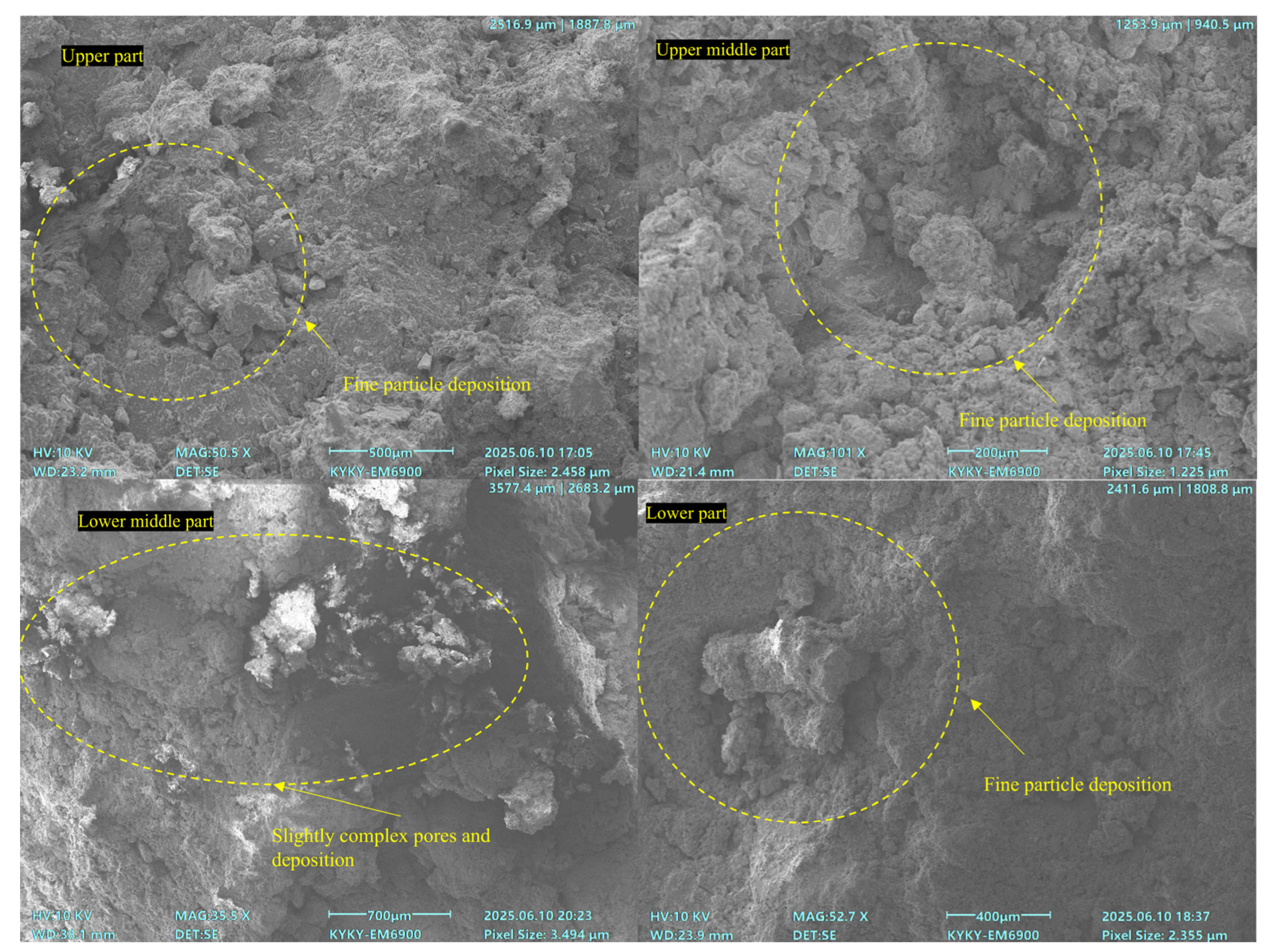 Figure 9. It also experienced a significant loss of fine particles. These factors resulted in fewer interparticle contacts. In contrast, both upper middle and lower middle parts had small and blocked pores. This indicated severe particle deposition. Fine particles from the upper part were deposited in the upper middle part. Some fine particles from the lower middle part were deposited in the lower part. This caused pore blockage in the lower part. Although the lower part’s pores were complex, their large size and low number made it hard to form interlocking structures. Particle loss mainly occurred in the upper part. Most deposition happened in the upper middle and lower middle parts. This distribution caused the difference in