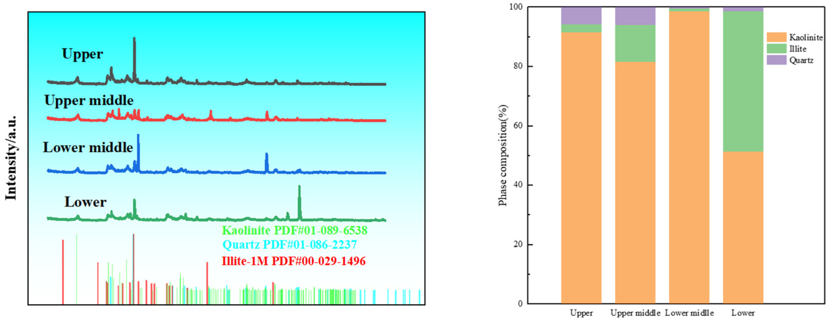 Figure 7 that the deposition increases with burial depth. This makes quartz more abundant in the upper and upper middle parts than in the lower middle and lower parts. Some quartz moves from the upper to the upper middle part and from the lower middle to the lower part. Kaolinite and illite have the highest relative contents in the lower middle and lower parts, respectively. This indicates that kaolinite and illite are lost from the upper and upper middle parts, and they mainly deposit in the lower middle and lower parts. This makes the lower part have the highest