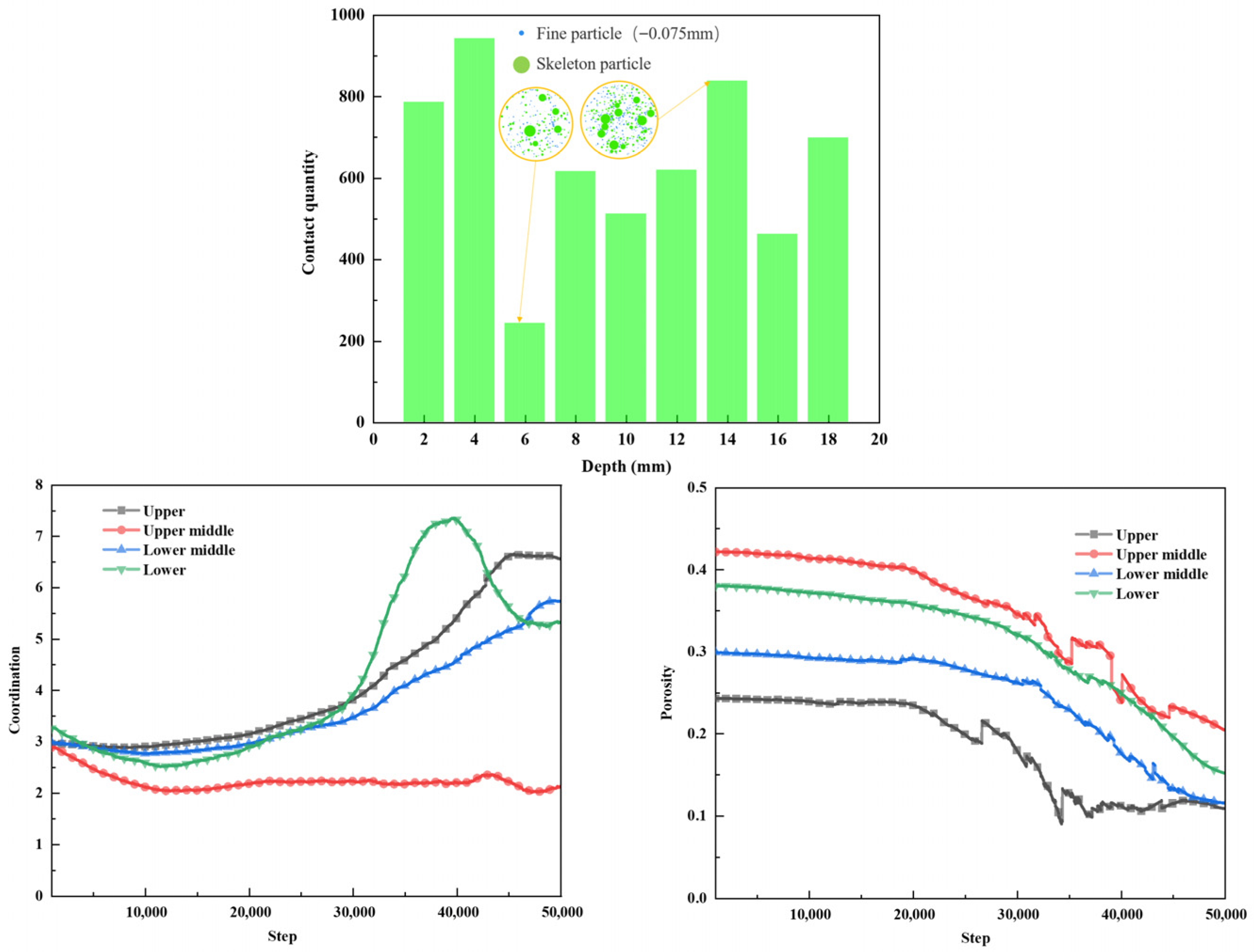 c increases with contact number. Initially, the coordination number experienced a slight decline across all areas due to fluid-induced particle dispersion. As the process of particle migration began to unfold, the coordination number in the upper and lower middle parts displayed a steady upward trend. This increase suggests that these regions were undergoing active deposition. On the other hand, the upper middle part exhibited minimal change in coordination number, indicating that deposition in this area was relatively limited. In the lower part, the coordination number initially increased, which could be attributed to the initial stages of particle deposition. However, it then decreased, possibly due to the clearance of blockages caused by the deposited particles. Finally, it stabilized, implying that a balance had been achieved between deposition and blockage clearance.