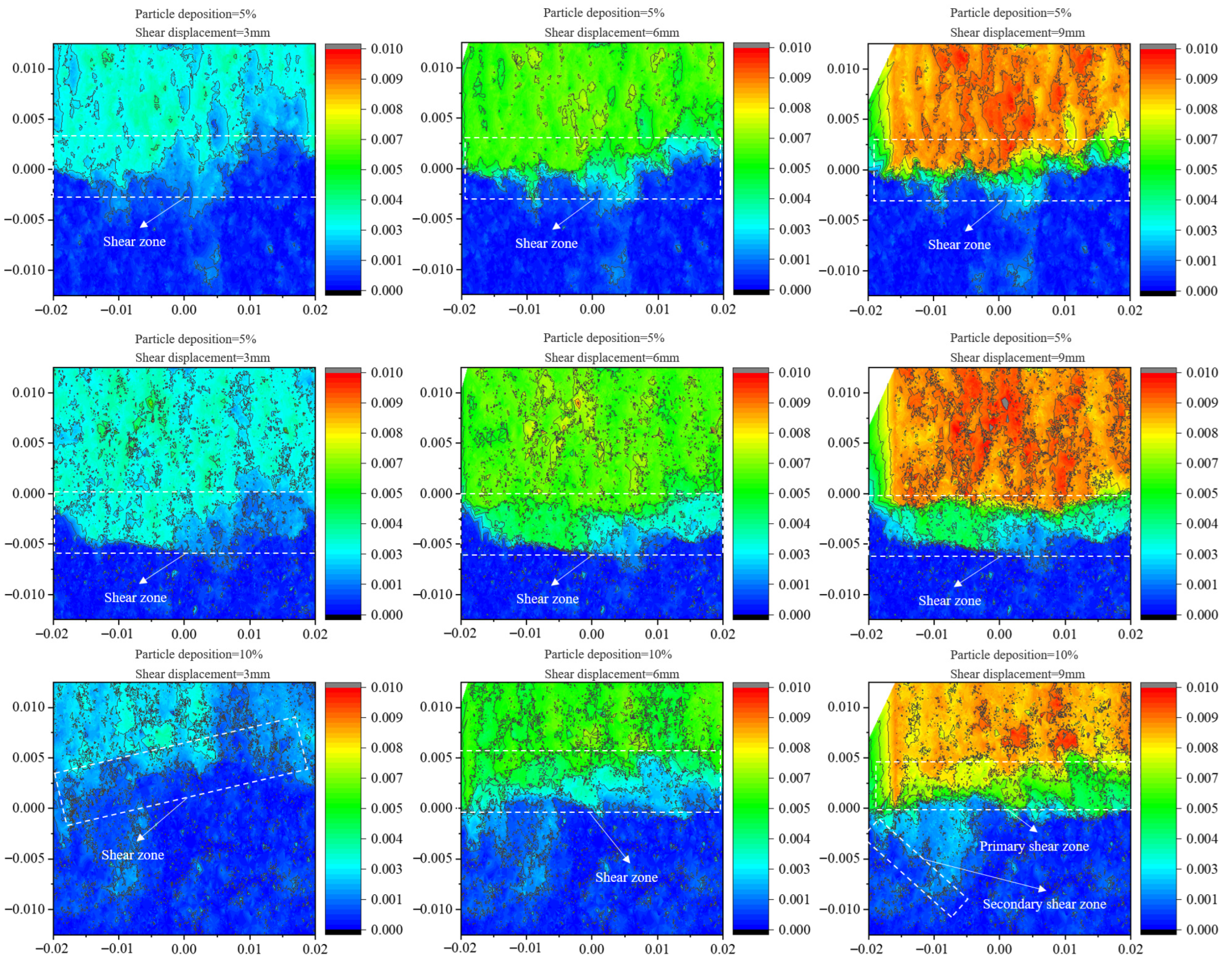 In the 5% deposition sample, after 3 mm of shear displacement, the left end of the shear band tilted downward and failed, and the sample had better integrity, indicating increased c and φ. The fine-particle deposition increased the contact points and friction between particles, thus improving the material’s shear resistance.