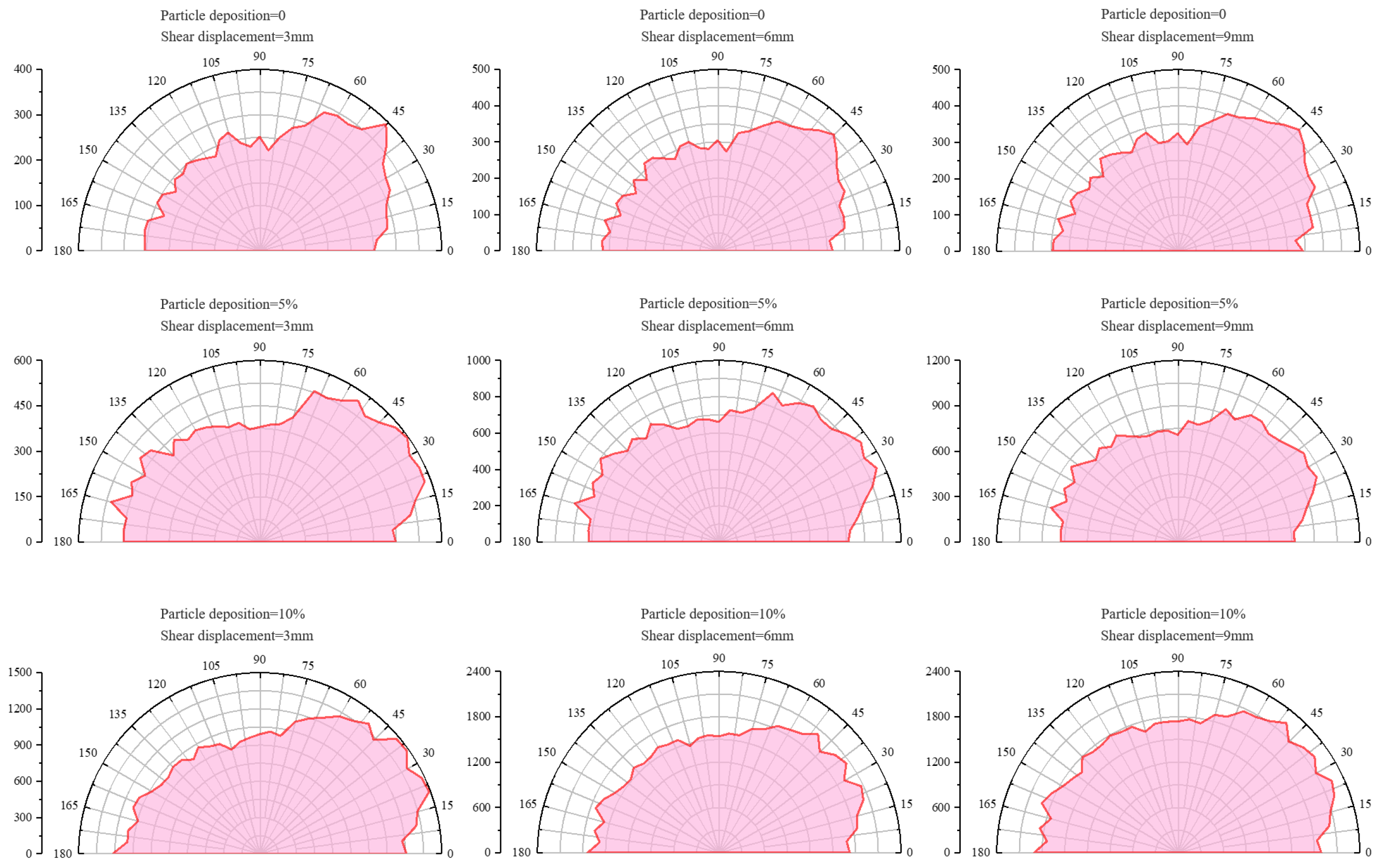 Figure 16 displays the rose diagrams of crack dip angles after shearing samples with different fine particle deposits. It was evident that increased deposition significantly boosted