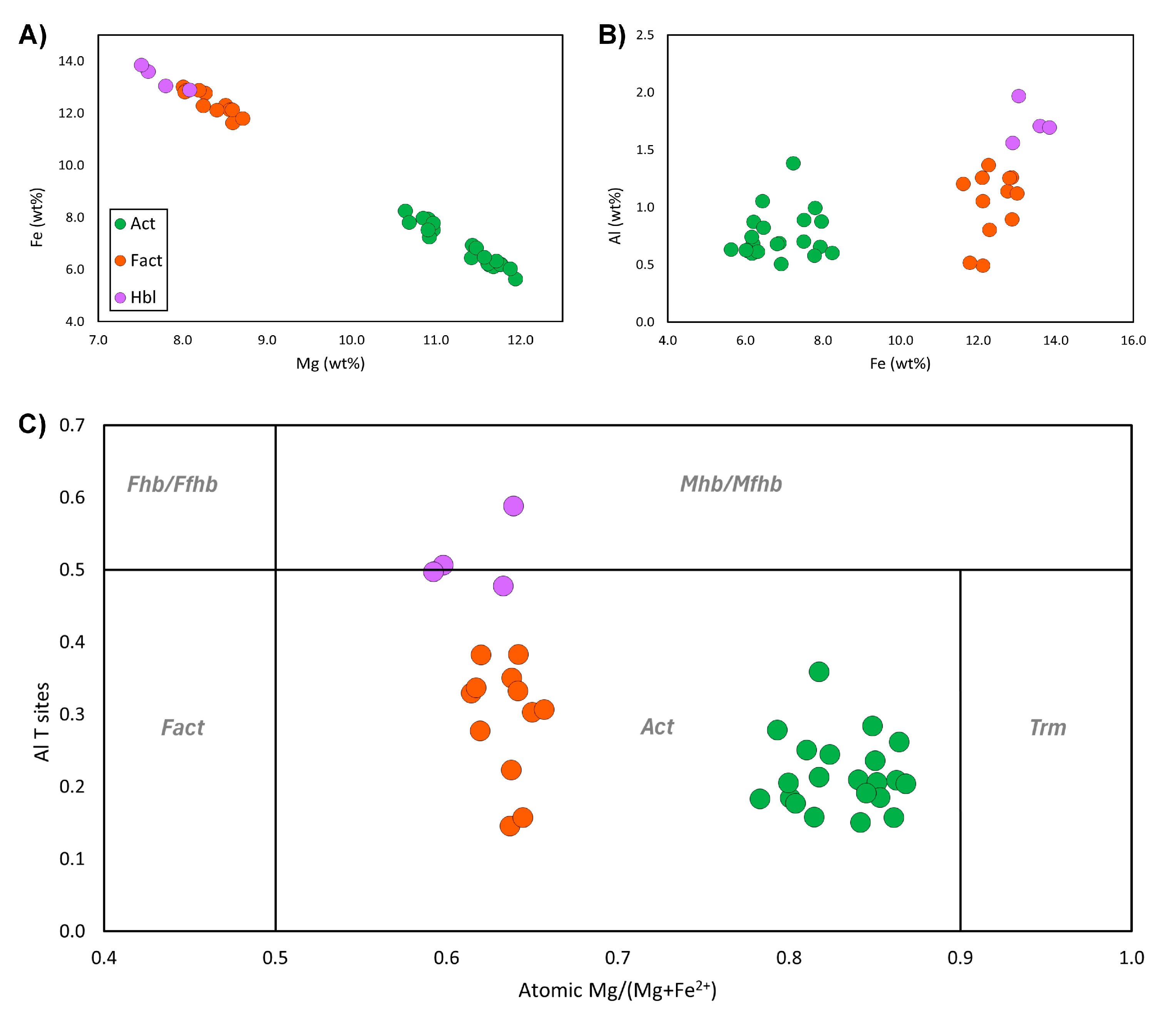 - Fe3+ substituting for Al in the octahedrally coordinated “C” sites. If Fe3+ > Al, we have ferri-hornblende, ideally Ca2(MgFe3+)(AlSi7O22)(OH)2.