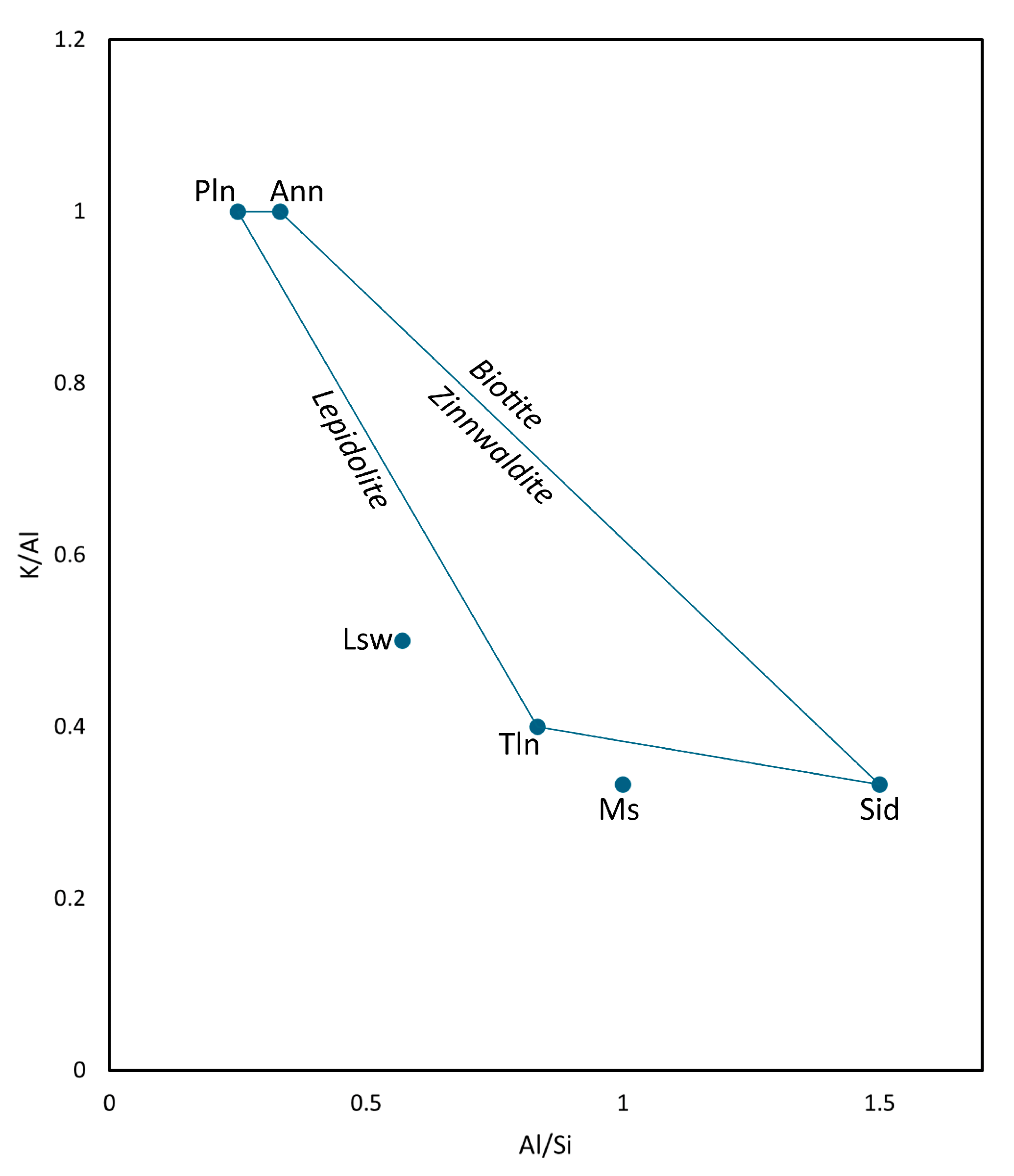 - Monier, G.; Robert, J.-L. Evolution of the miscibility gap between muscovite and biotite solid solutions with increasing lithium content: An experimental study in the system K2O-Li2O-MgO-FeO-Al2O3-SiO2-H2O-HF at 600 °C, 2 kbar PH2O: Comparison with natural lithium micas. Mineral. Mag. 1986, 50, 641–651. [Google Scholar] [CrossRef]