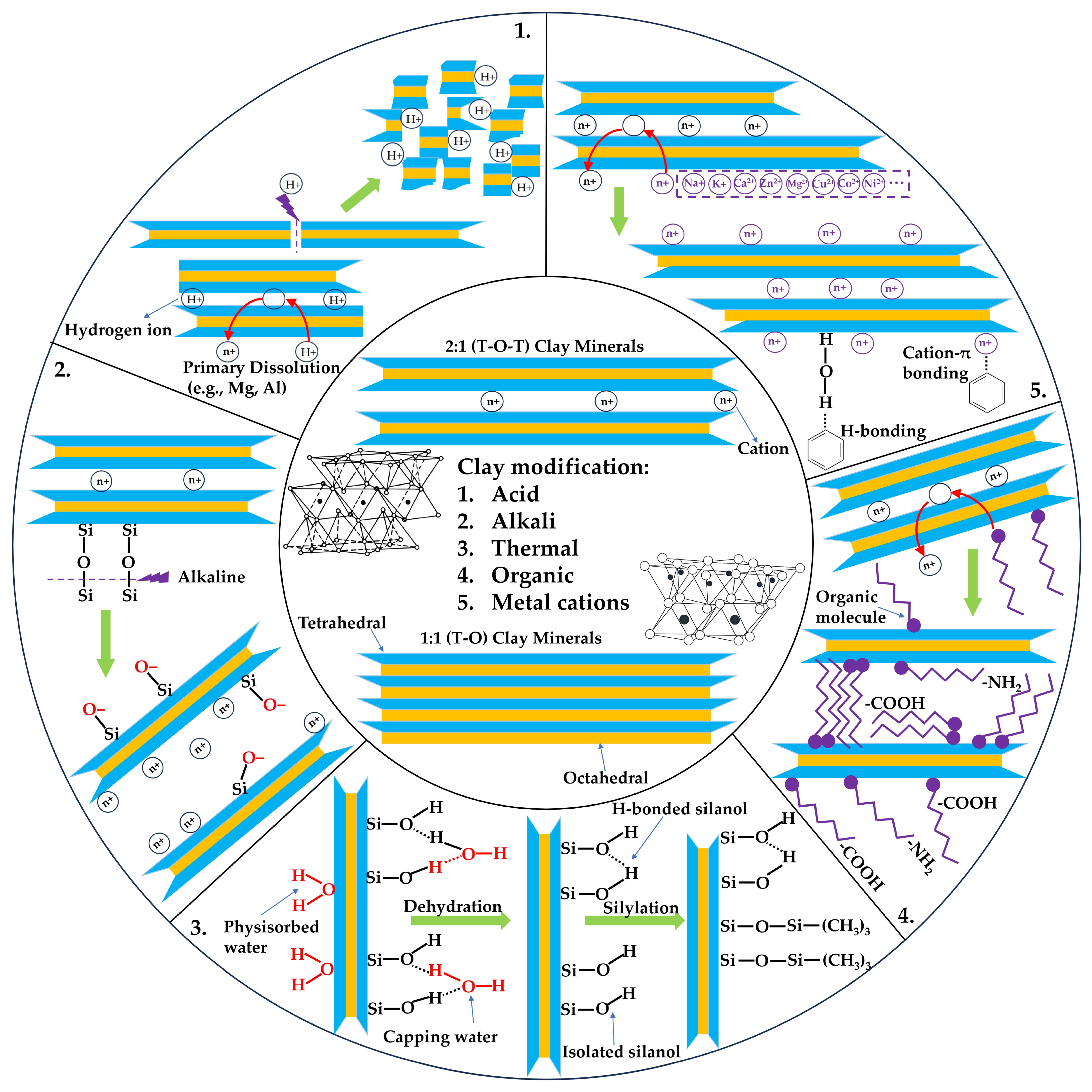 - Komadel, P. Chemically modified smectites. Clay Miner. 2003, 38, 127–138. [Google Scholar] [CrossRef]