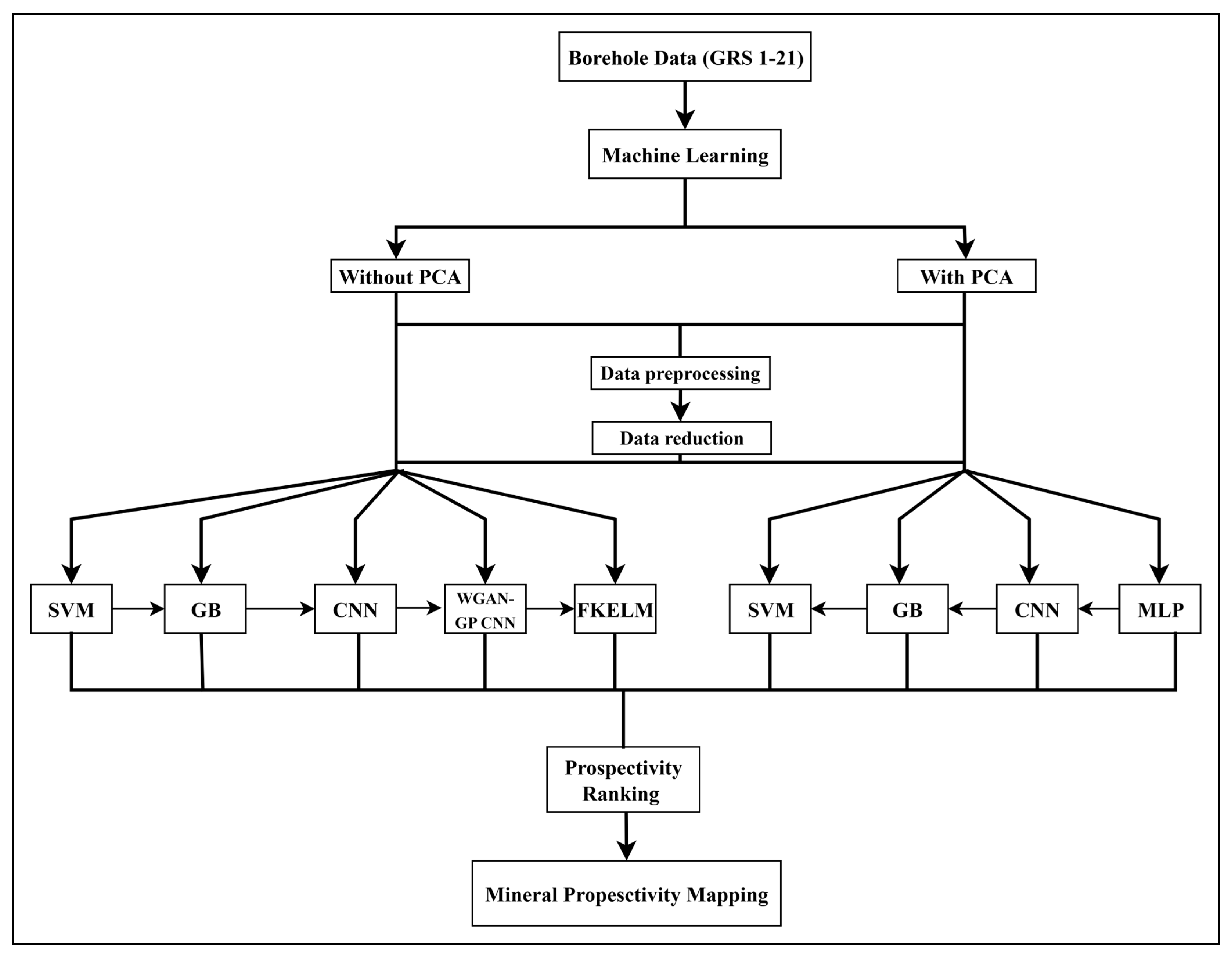 - Zhang, H.; Xie, M.; Dan, S.; Li, M.; Li, Y.; Yang, D.; Wang, Y. Optimization of Feature Selection in Mineral Prospectivity Using Ensemble Learning. Minerals 2024, 14, 970. [Google Scholar] [CrossRef]