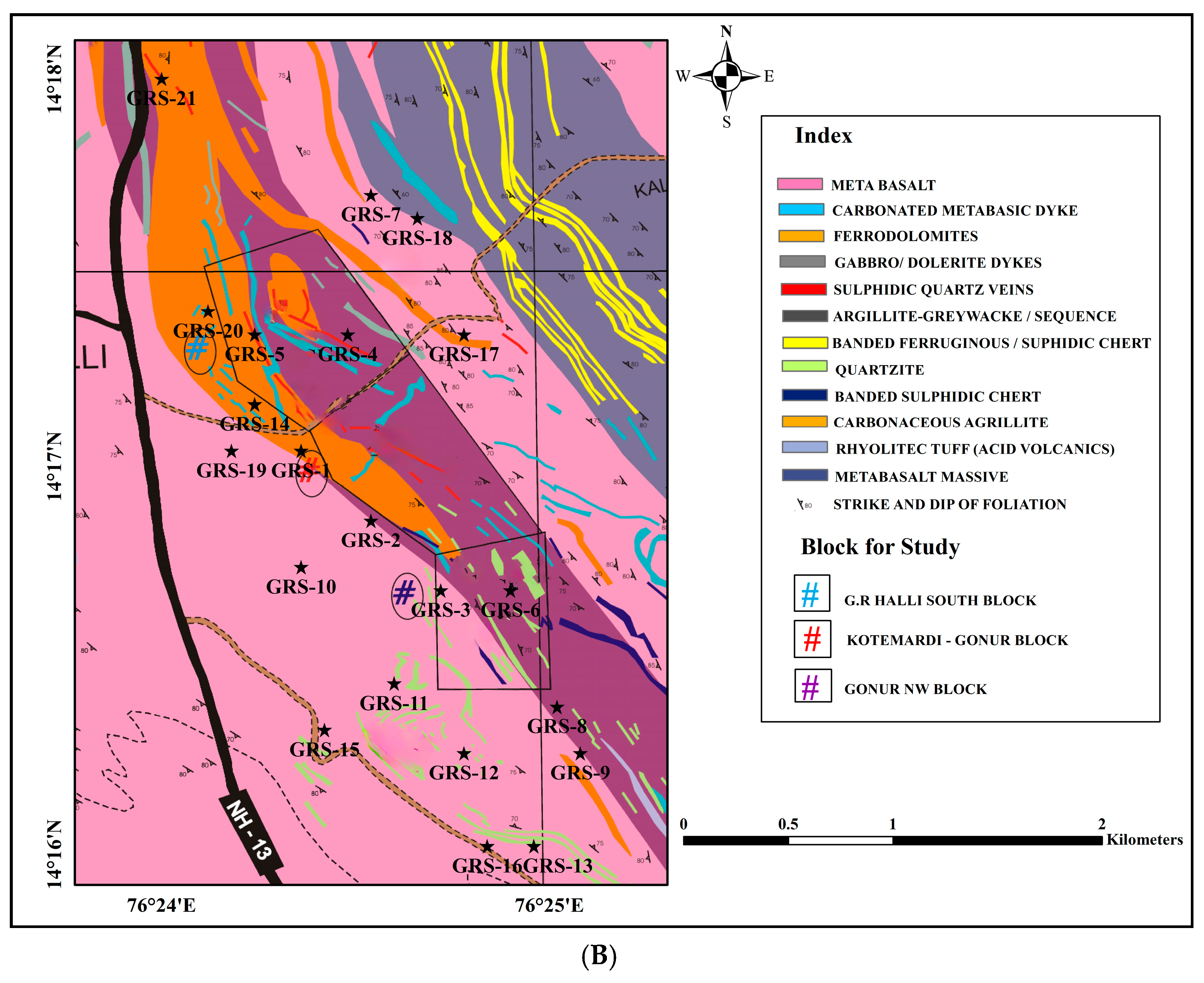 - Khan, S.A. Final Report on Investigation for Gold in G. R. Halli South Block, Chitradurga Schist Belt. Geol. Surv. India Unpub. Prog. Rep. FS 1993, 1992, 1994–1995. [Google Scholar]