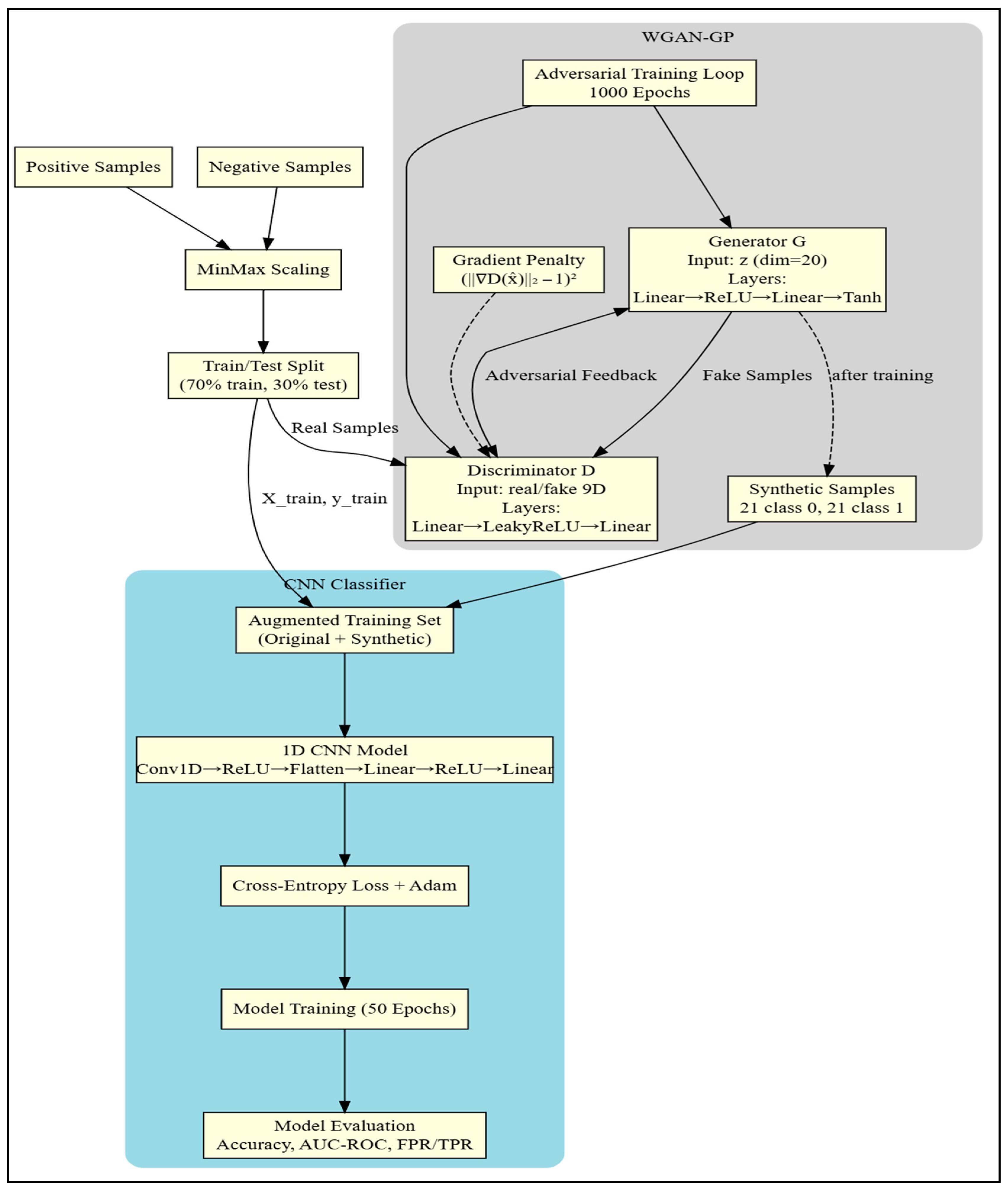 - Critic D: Input x ∈ R9. Layers: Linear(9, 128) → LeakyReLU(0.2) → Linear(128, 64) → LeakyReLU(0.2) → Linear(64, 1).