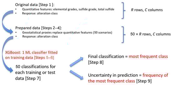 The proposed methodology extends the framework established by [7], who combined kriging with machine learning for rock type prediction. The present study introduces a key innovation by replacing kriging with geostatistical simulation, and by using nugget effect filtering to remove short-scale spatial variation (“noise”) in laboratory-measured values. Specifically, each original feature at a data location will be substituted with 50 normally distributed simulated proxies to improve predictive performance and to quantify prediction uncertainty. The methodology circumvents reliance on the original observations by generating multiple realizations by stochastic simulation, which preserves the statistical and spatial behavior of the feature variables, except for short-scale variations.
