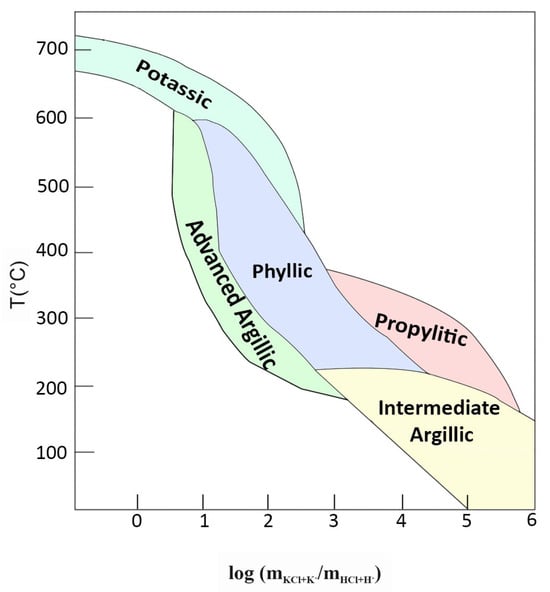 In the entire spectrum of hydrothermal alteration, the most conspicuous zoning type is that of porphyry Cu (±Au, ±Mo) deposits in which alteration zones are arranged as concentric shells [5]. Porphyry deposits arguably represent the most economically important and fertile class of nonferrous metallic mineral resources. These deposits are characterized by sulfide and oxide ore minerals in veinlets and disseminations in large volumes of hydrothermally altered rock. Metals are transported as complex ions in the circulating hydrothermal fluids. As metasomatism increases and temperature decreases, alteration types move from potassic to propylitic, phyllic, intermediate argillic, and advanced argillic, creating zones enriched in certain minerals, thereby allowing to focus exploration activity towards exact targets.
