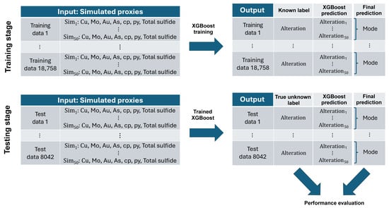 A major benefit of this approach lies in its robustness under data constraints—specifically, scenarios characterized by (a) substantial missing values among features, (b) a restricted number of influential features, and (c) sparse sampling. To compare the importances of the two sets of features—the original measured set versus the simulated proxies—we tested the individual classification performances by a machine learning algorithm, namely eXtreme Gradient Boosting (XGBoost). The categorical response is a total of six different wall-rock alteration types spatially distributed within the ore deposit. To address class imbalance, a cost-sensitive classification strategy is furthermore employed, informed by criteria rooted in thermodynamics and mineral exploration, to minimize the expected misclassification cost and to improve model reliability.