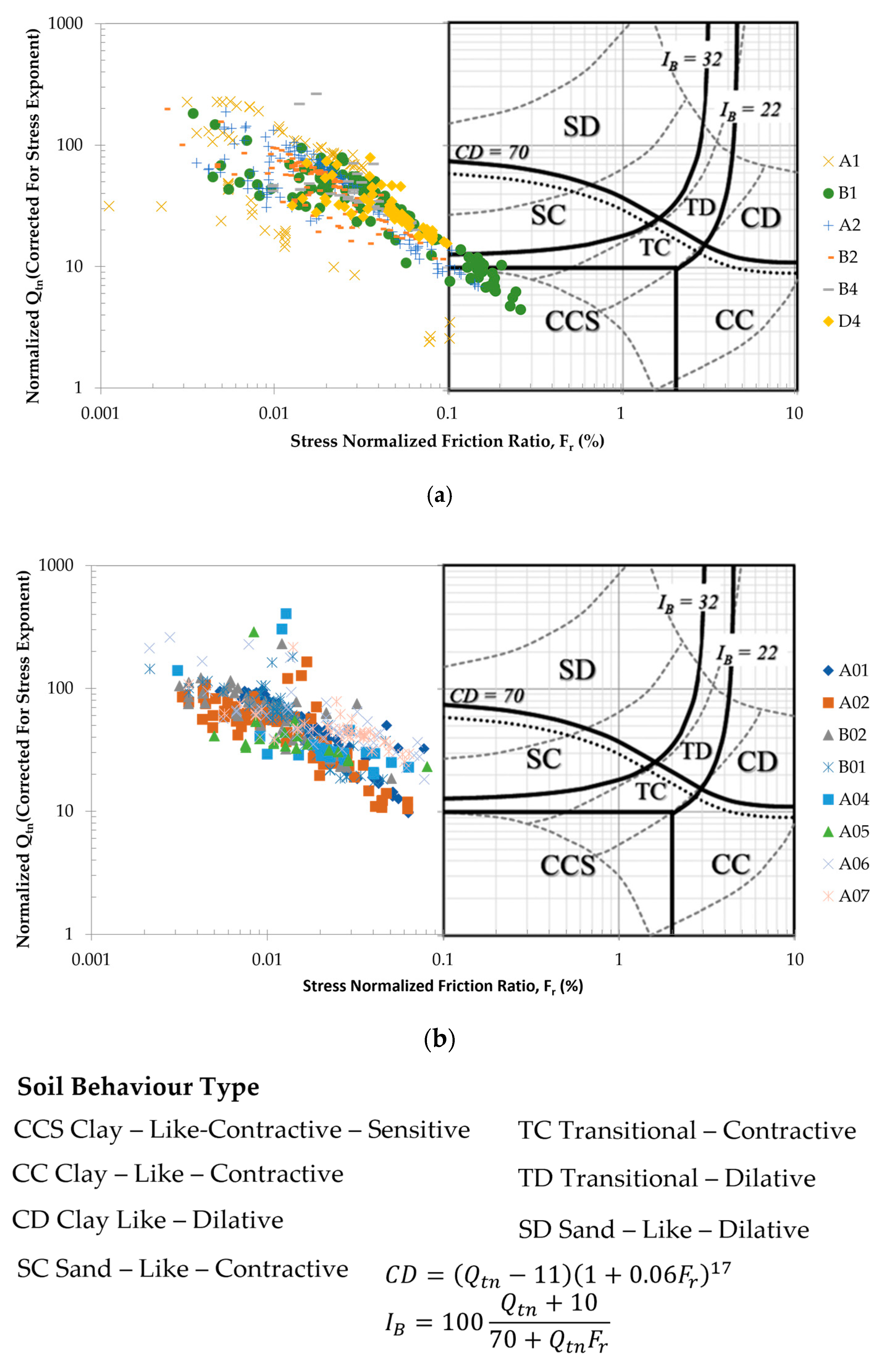 - Robertson, P.K. Cone penetration test (CPT)-based soil behaviour type (SBT) classification system—An update. Can. Geotech. J. 2016, 53, 1910–1927. [Google Scholar] [CrossRef]