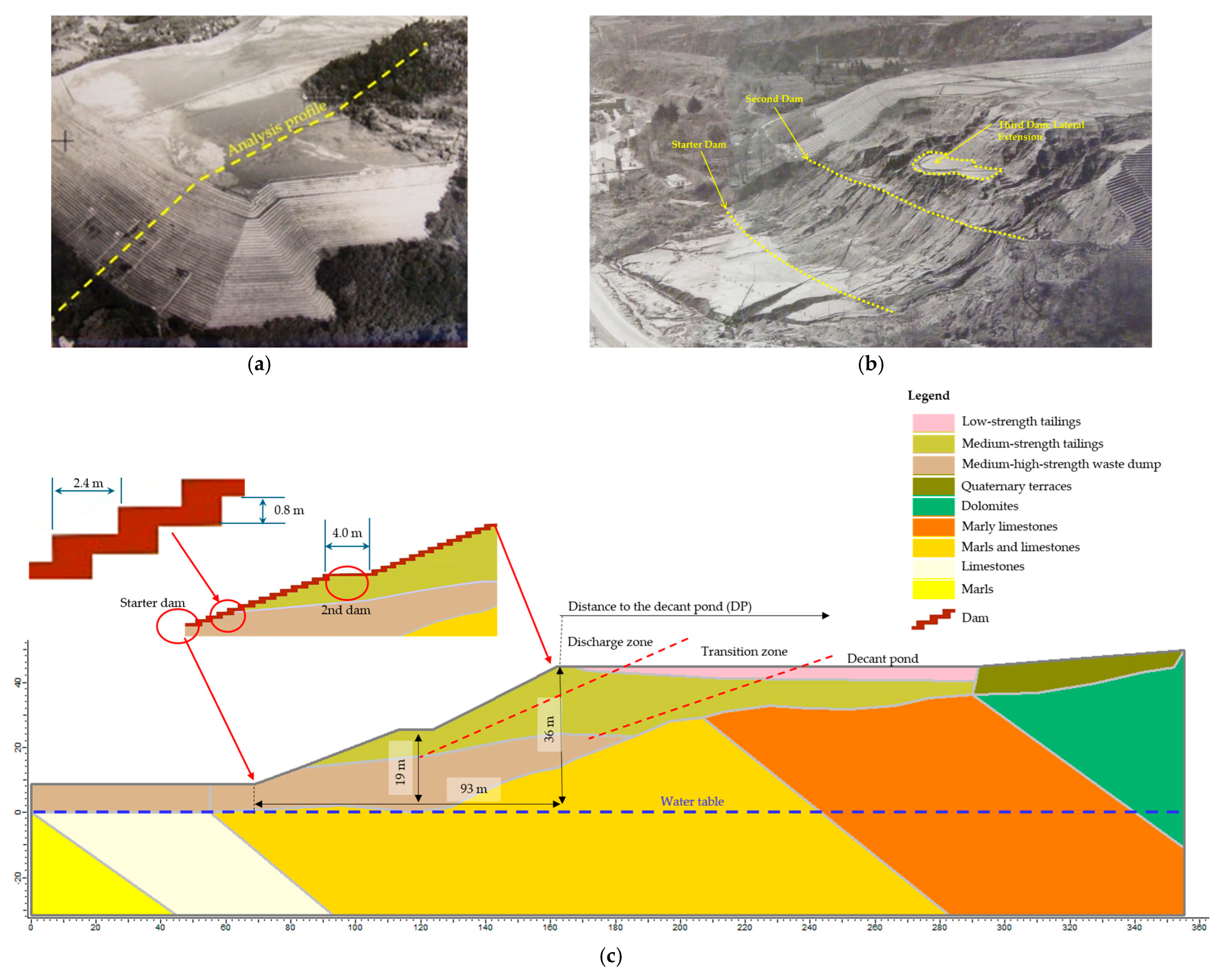 - Scientific motivation—to demonstrate how an evidence-based forensic approach, rather than a traditional back-analysis, can reconstruct historical TSF failures under uncertainty, identifying the relative contribution of stratigraphic heterogeneity, saturation, and construction method to the onset of instability.